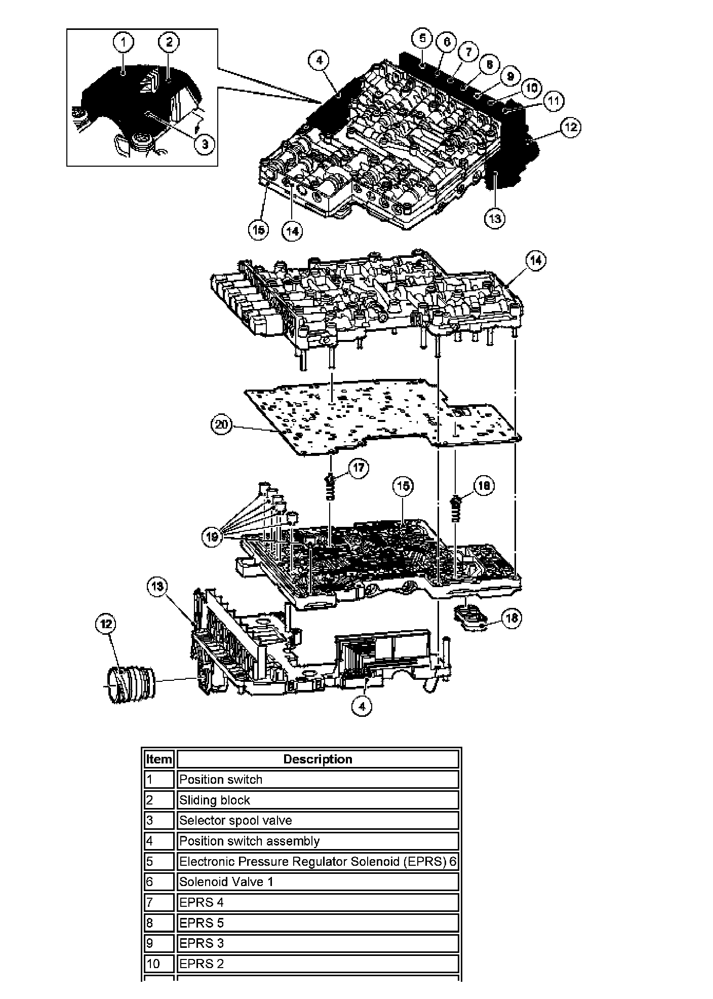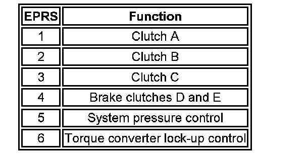 Six Electronic Pressure Regulator Solenoids (EPRS) are located in the valve block. The solenoids are controlled by Pulse width Modulation (PWM) signals from the TCM. The solenoids convert the electrical signals into hydraulic control pressure proportional to the signal to actuate the spool valves for precise transmission operation.