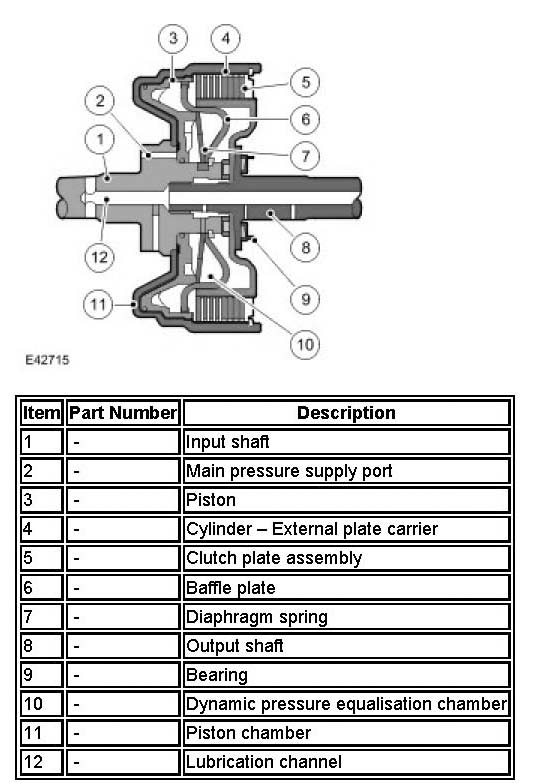 When clutch application is required, main pressure from the fluid pump is applied to the piston chamber from the supply port. This main pressure overcomes the low pressure fluid present in the dynamic pressure equalization chamber. The piston moves, against the pressure applied by the diaphragm spring, and compresses the clutch plate assembly. When the main pressure falls, the diaphragm spring pushes the piston away from the clutch plate assembly, disengaging the clutch.