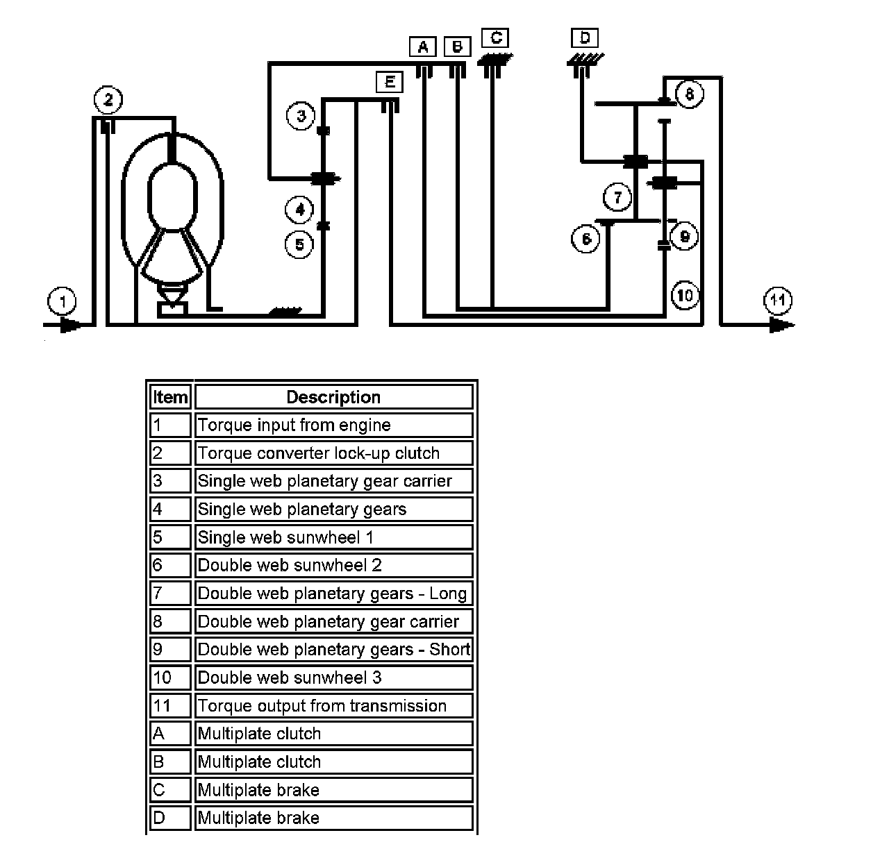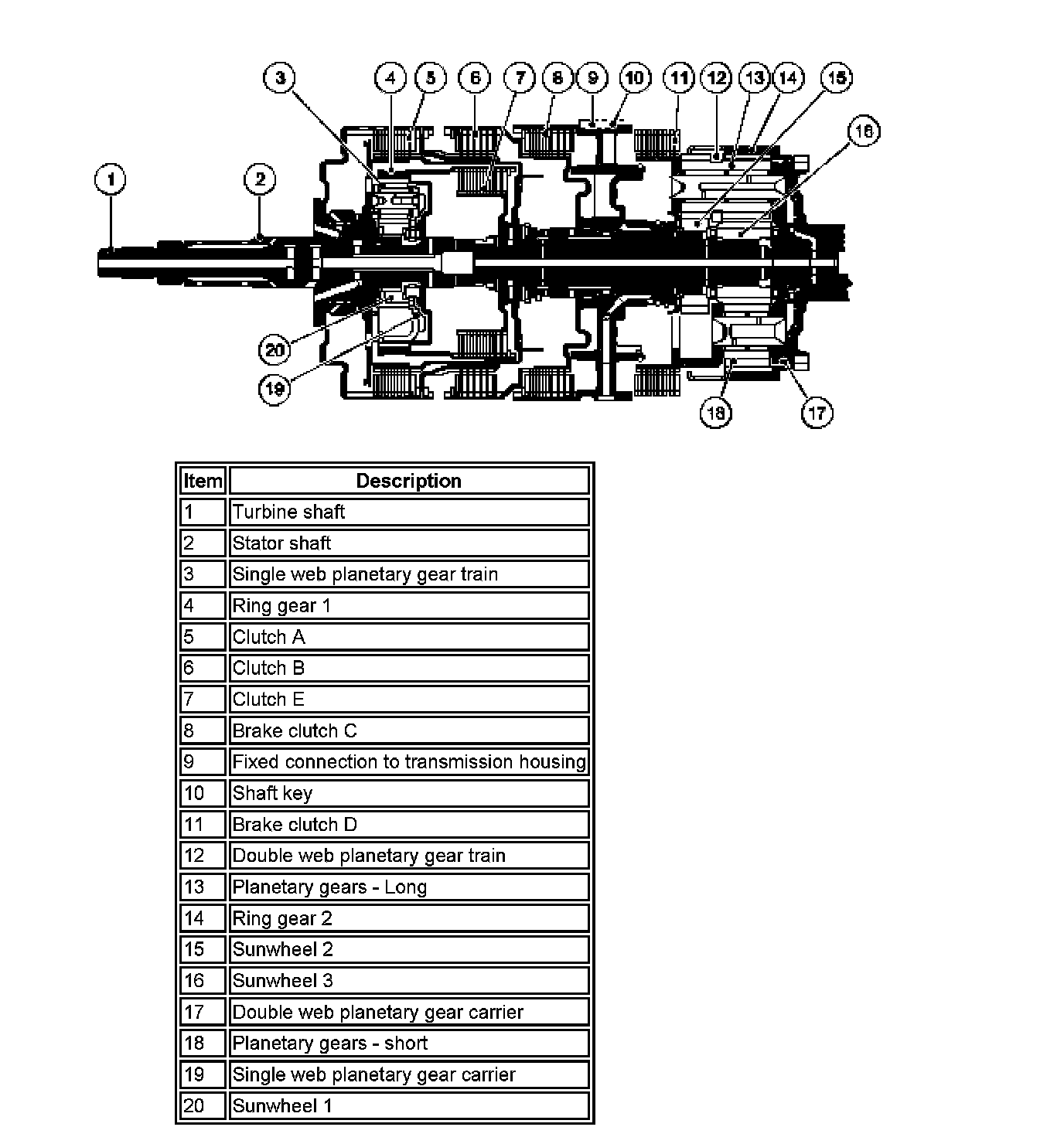 The following table shows which clutches are operating for selected gear ratios to produce the required torque output from the transmission.