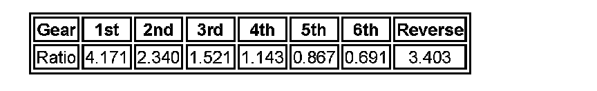 Engine torque is transferred, via operation of single or combinations of clutches to the two planetary gear trains. Both gear trains are controlled by reactionary inputs from brake clutches to produce the six forward gears and one reverse gear. The ratios are as follows: