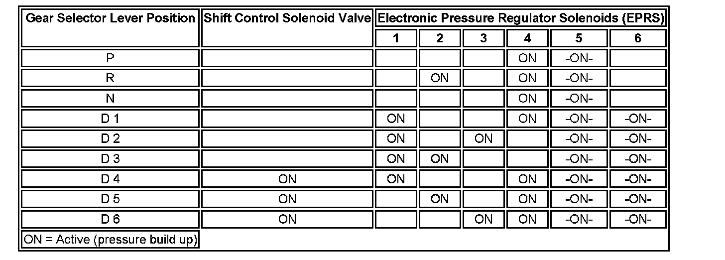 The following table shows which solenoids are activated to produce the required torque output from the transmission.