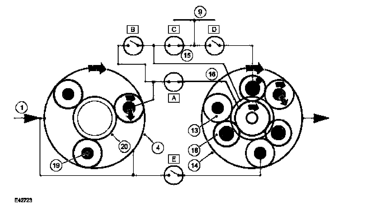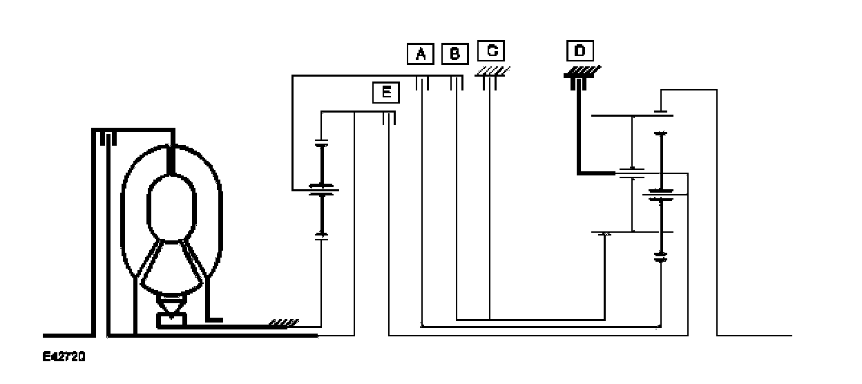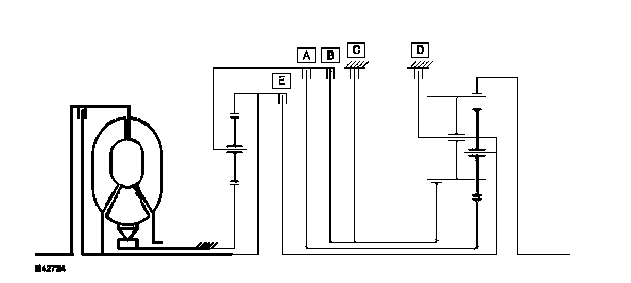 The shift elements are three rotating multiplate clutches (A, B and E) and two fixed multiplate brakes @ and D). All shifts from 1st to 6th gears are power-on overlapping shifts. Overlapping shifts can be described as one of the clutches continuing to transmit drive at a lower main pressure until the next required clutch is able to accept the input torque.
