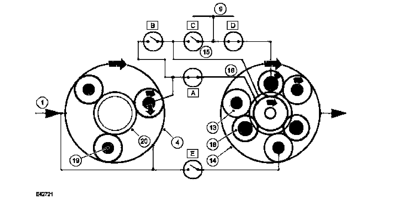 The gear selector lever and the manual selector spool valve are in the U position. Engine torque is transmitted from the torque converter turbine shaft to the ring gear 1 of the single web planetary gear train and the outer plate carrier of clutch 'E'.
