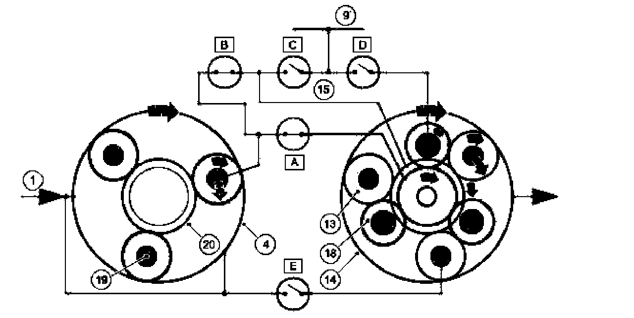 Ring gear 1 drives the planetary gears which rotate around sunwheel 1. This drives the planetary gear carrier 1 and also the outer plate carrier of clutch 'A' and the inner plate carrier of clutch '13'.