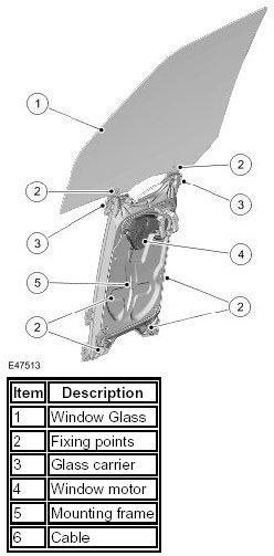 Electric windows are installed in all four doors. The drivers front window incorporates a self-contained 'Anti-trap' regulator, which features one-shot up and one-shot down functionality. All the passenger windows are hard wired and are powered via the window lift relay in the Central Junction Box (CJB). The one-shot and one-shot down feature is also fitted to the front passenger window of vehicles from 2007 model year onwards.