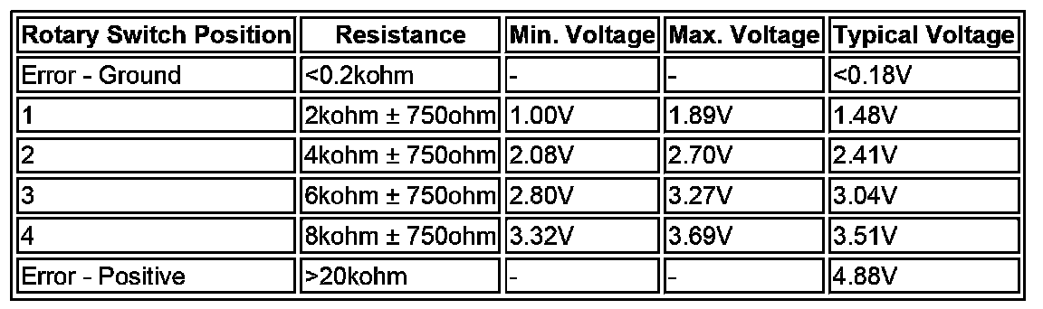 The rotary potentiometer selects differing resistance values for each position. The potentiometer is connected into a voltage divider circuit, with a 6.8kohm resistor located in the GEM. The power supply to the voltage divider circuit is limited to 6.5V. This reduced voltage is used by the GEM to determine the position of the rotary switch as follows: