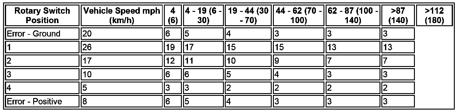 The intermittent delay is also influenced by the road speed of the vehicle using a signal value derived from the ABS control module on the K bus. The time delay periods for the vehicle stationary and when moving at different speeds are shown in seconds in the following table: