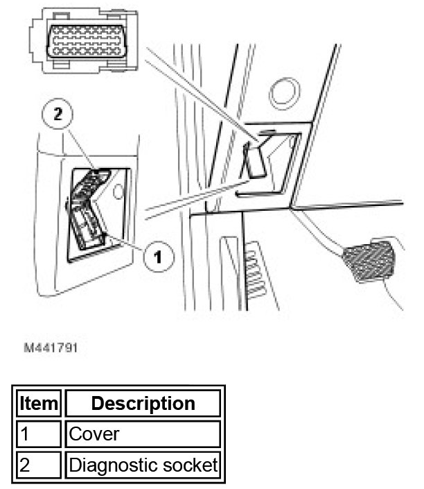 The diagnostic socket allows the transfer of information between the GEM, the rain/light sensor and the Land Rover approved diagnostic system. The diagnostic socket is located in the fascia, in the driver's side stowage tray. The socket is secured in the fascia and protected by a hinged cover.