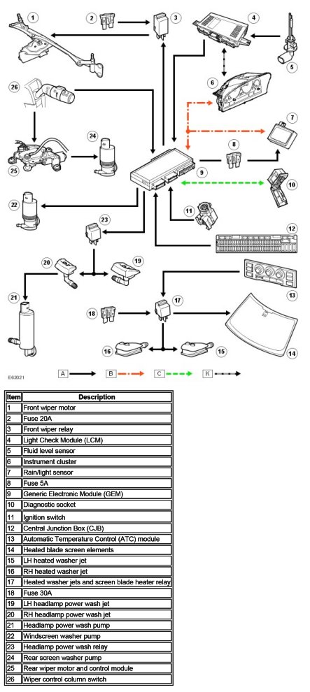 The heated washer jets are controlled by the ATC system and a heated washer jet relay in the passenger compartment fusebox. The ATC receives ambient temperature from the instrument pack on the K bus.