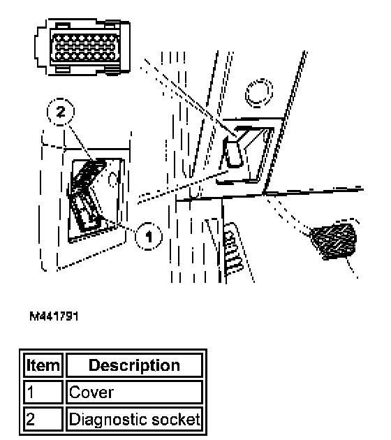 The diagnostic socket allows for the transfer of information between the LCM and T4.The diagnostic socket is located in the instrument panel, in the driver's stowage tray. The socket is secured in the instrument panel and protected by a hinged cover.