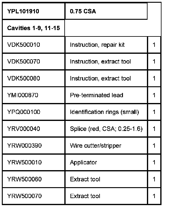 NOTE: Before commencing a repair, refer to the appropriate 'Service Repair Kit' table (see example in Table 1 below) for details of the correct tools and replacement components. The 'Service Repair Kit' table (where appropriate) can be found beneath the 'Connector Details' in the Electrical Reference Library (ERL).