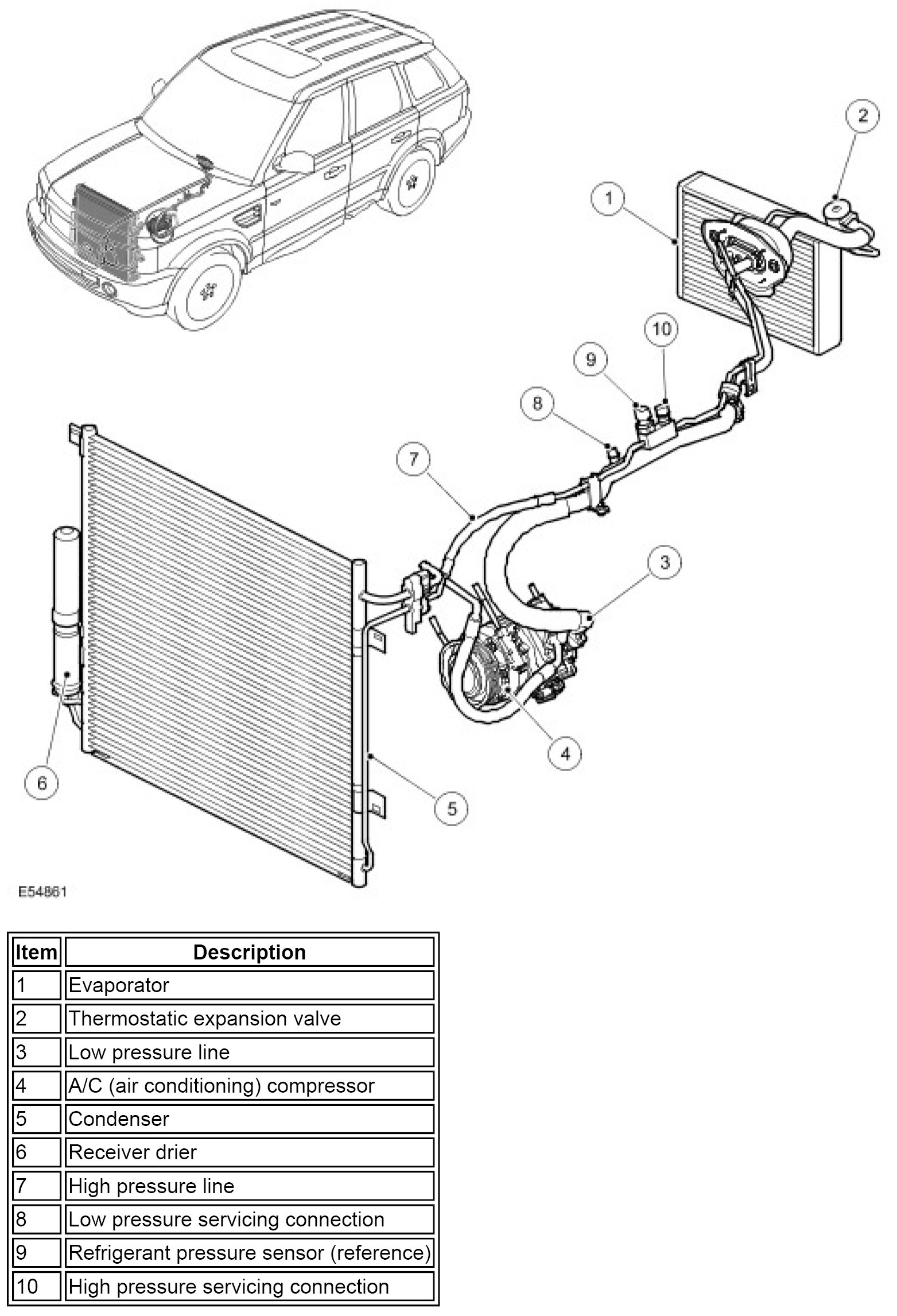 The A/C (air conditioning) compressor circulates the refrigerant around the system by compressing low pressure, low temperature vapor from the evaporator and discharging the resultant high pressure, high temperature vapor to the condenser. The A/C (air conditioning) compressors for the different engine types differ due to their individual installation requirements, but are otherwise the same.