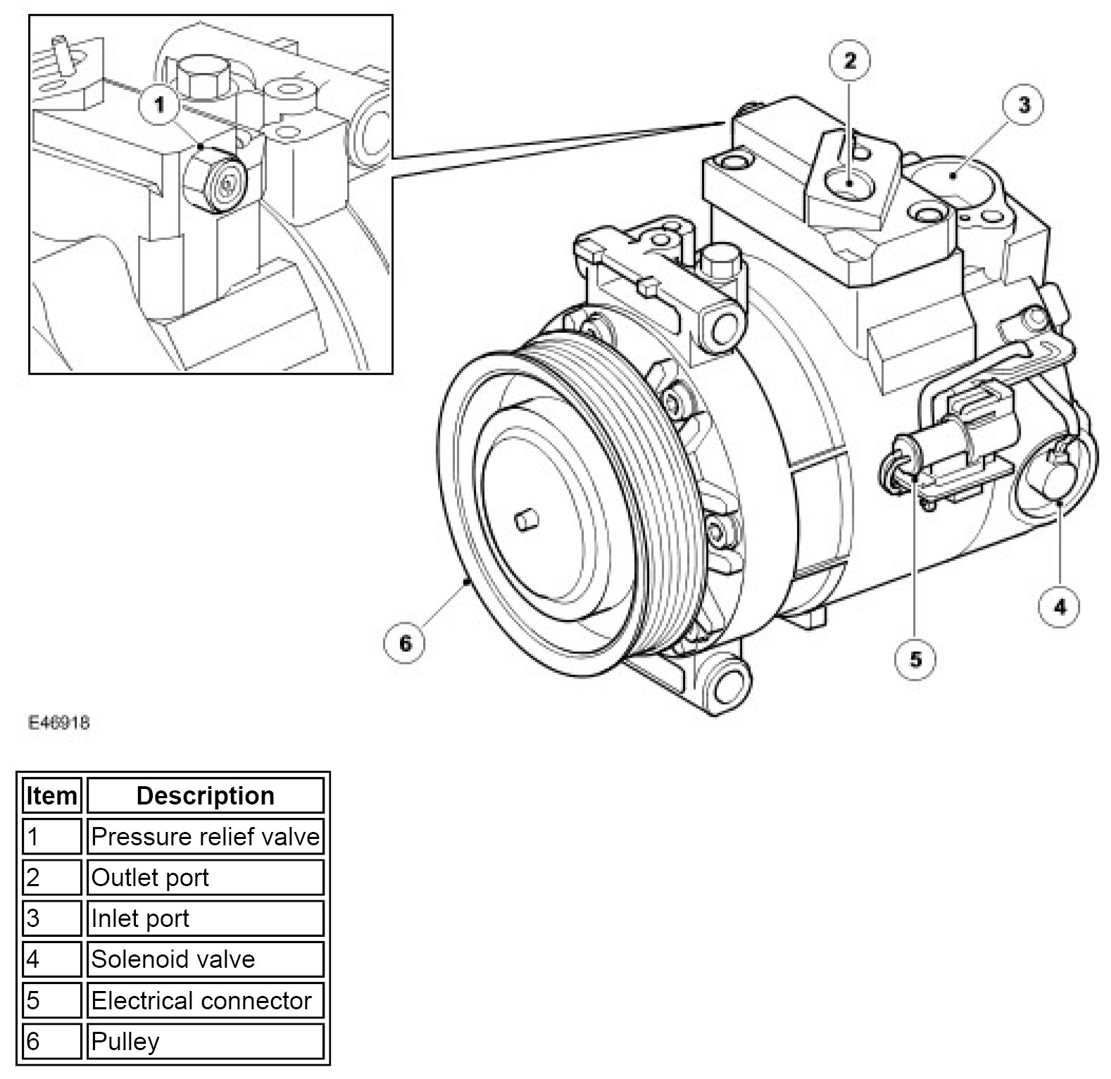 The A/C (air conditioning) compressor is a permanently engaged, variable displacement unit which is driven by the engine accessory drive belt. To protect the refrigerant system from excessive pressure, a pressure relief valve is installed in the outlet side of the A/C (air conditioning) compressor. The pressure relief valve vents excess pressure into the engine compartment.