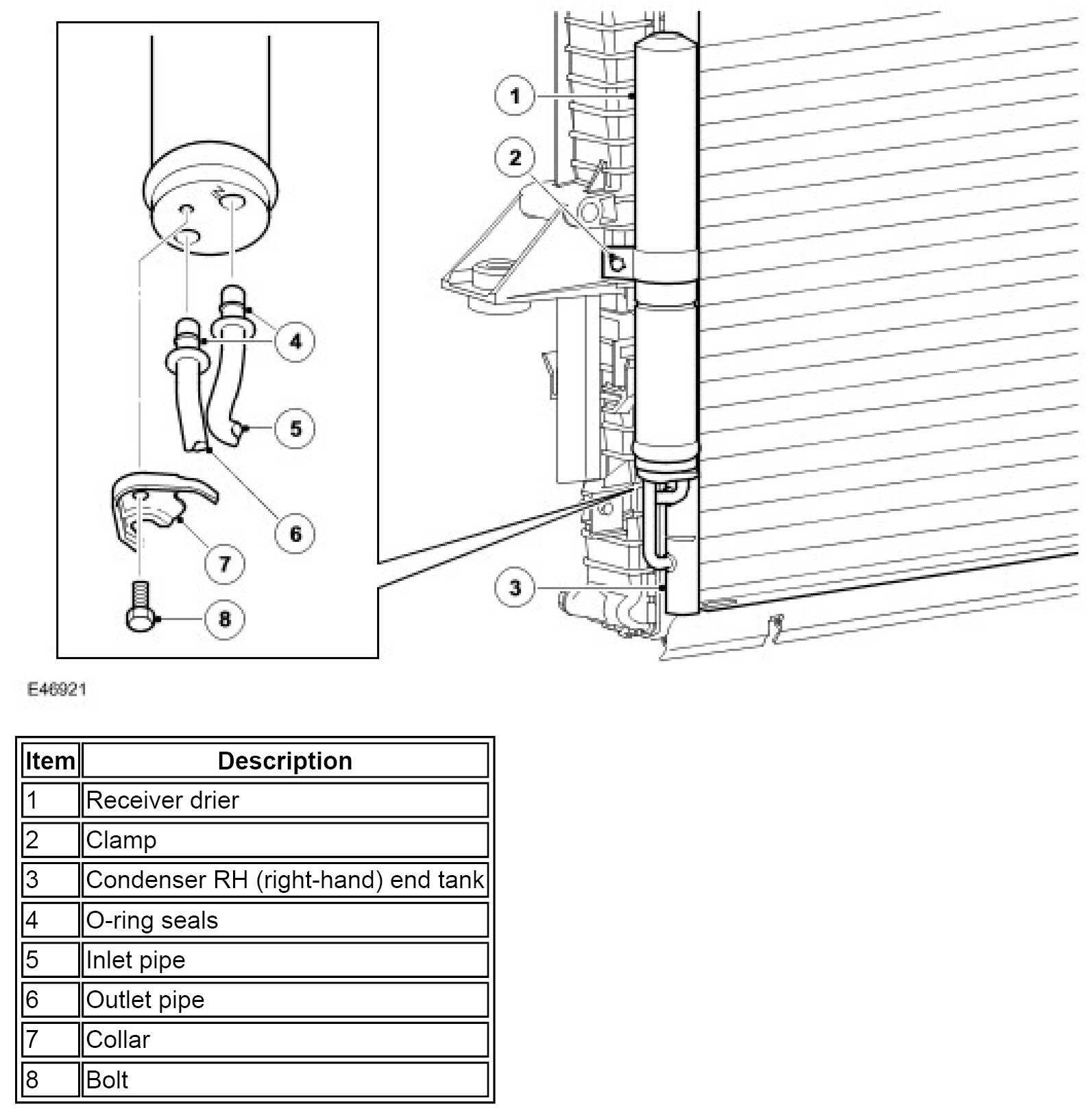 The receiver drier is attached to the two stub pipes on the right end tank of the condenser. A collar, located on lands on the stub pipes and secured with a bolt, attaches the stub pipes to the receiver drier. A clamp secures the body of the receiver drier to a bracket welded to the right end tank of the condenser. The inlet and outlet ports of the receiver drier are the same size, so care must be taken to install the receiver drier the correct way round on the stub pipes; to assist with installation, the inlet port is identified with the word IN etched into the receiver drier.