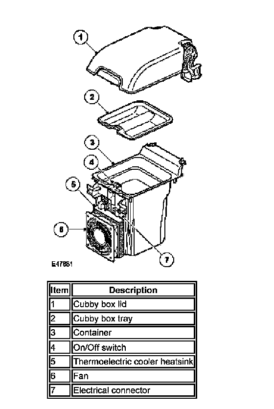 Operation of the thermoelectric cooler is controlled by an on/off switch on the top front edge of the container. A permanent battery feed is supplied to the on/off switch from the central junction box (CJB). A light emitting diode (LED) in the on/off switch is illuminated while the cool box is selected on.