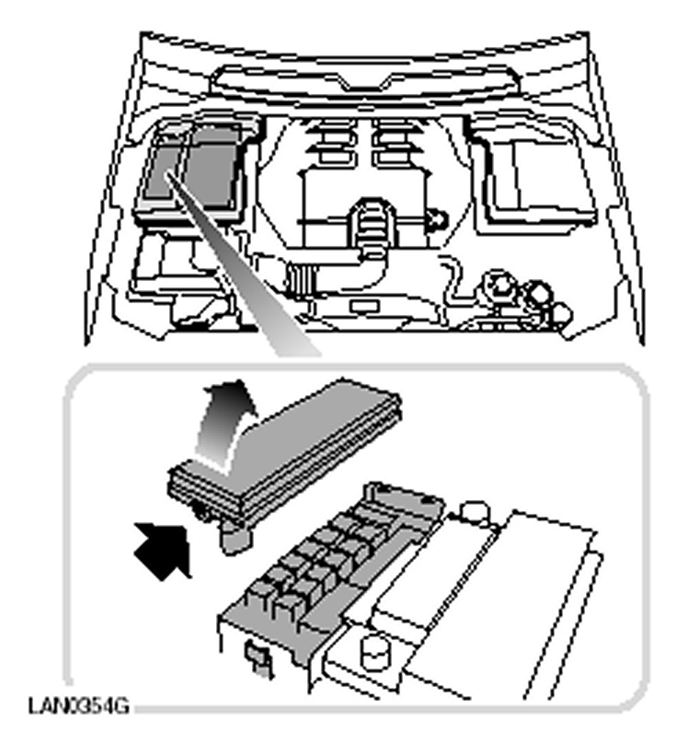 The engine compartment fuse box is located at the rear of the engine bay. To view the fuse box, the under-hood cover will have to be removed. The plastic lid of the box is removed by pressing the plastic tabs in.