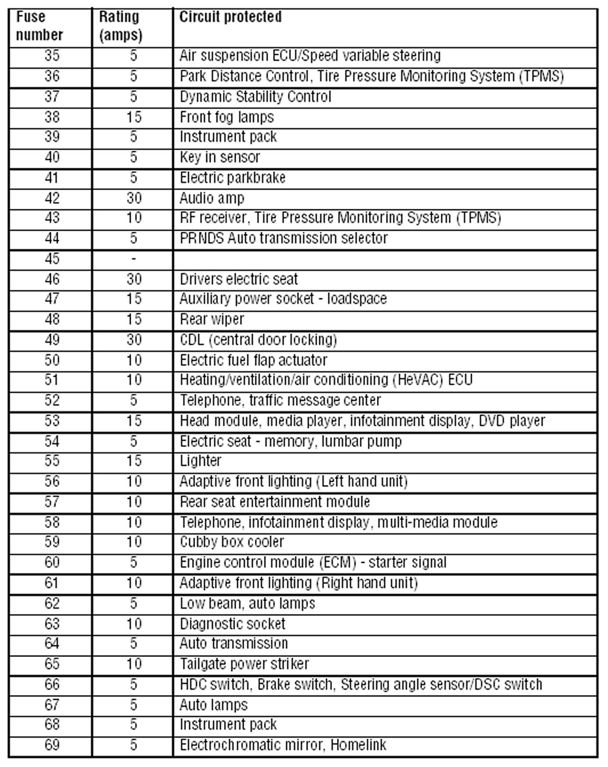 A label on the rear of the glovebox shows the circuits protected, the fuse values and their locations. They are also listed on the following page.
