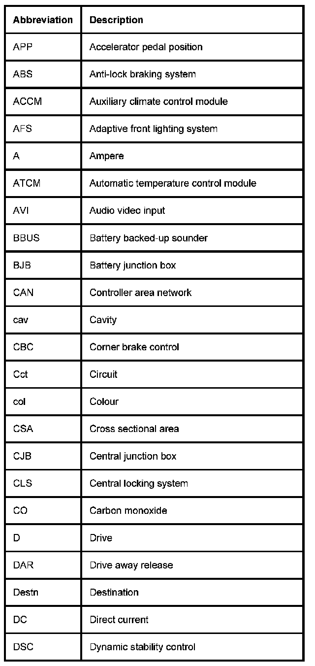 5. Cct: Identifies the model or option which uses the wire. 'ALL' means applicable to all models in the range fitted with the feature or system in question. In instances where different models, features or systems require different colour wires to be fitted in a cavity, each instance of the cavity is included in the pin-out table.