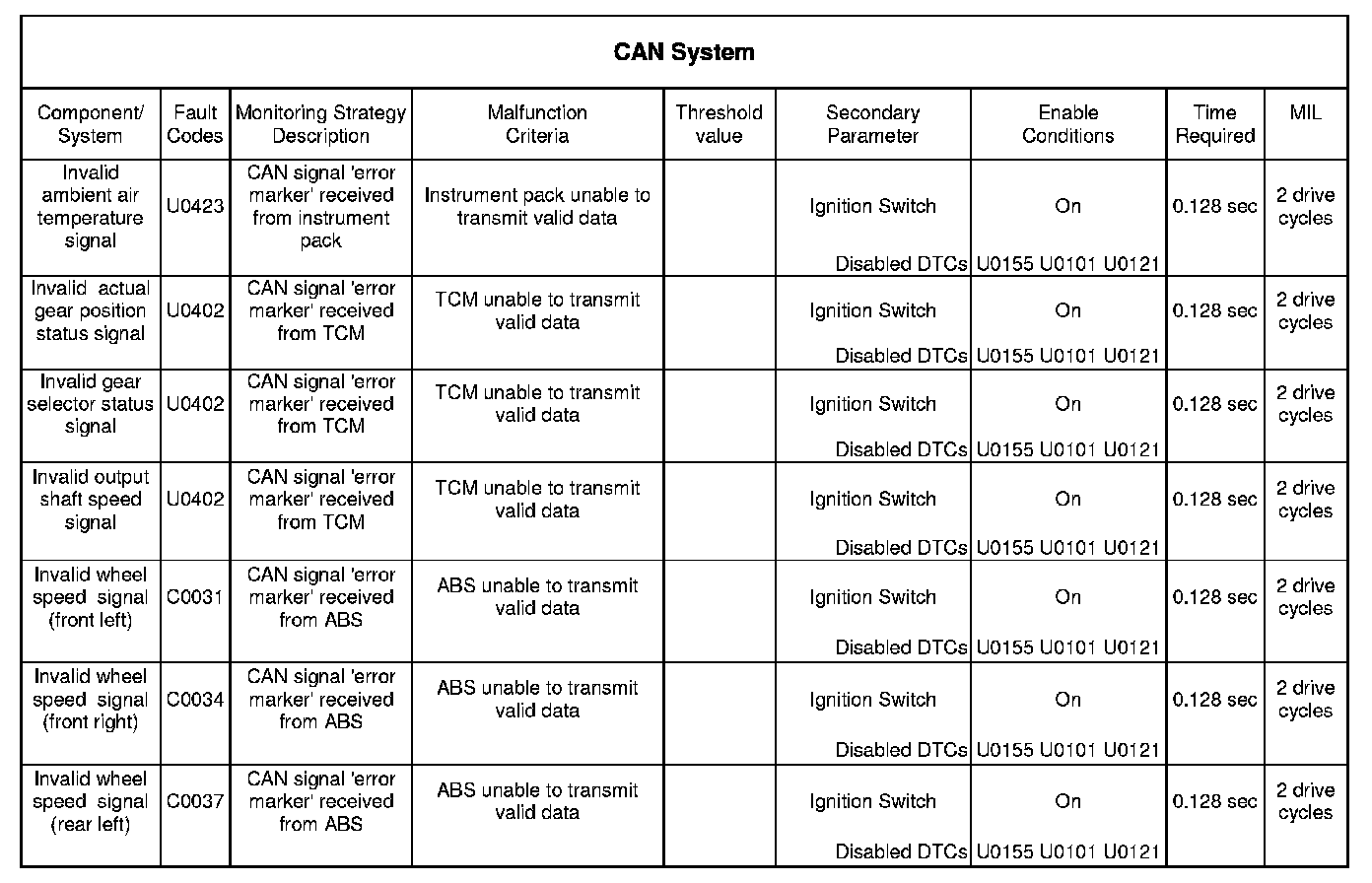 The Controller area network (CAN) system is monitored by the ECM for the following conditions.