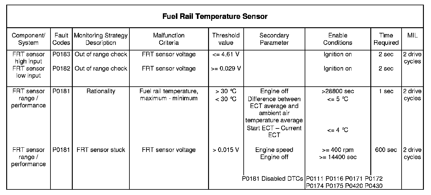 This monitor checks that the fuel rail temperature (FRT) sensor is not stuck at a particular value. If the engine has been off for greater than a calibrated time, then the next time the engine is started the diagnostic will run.