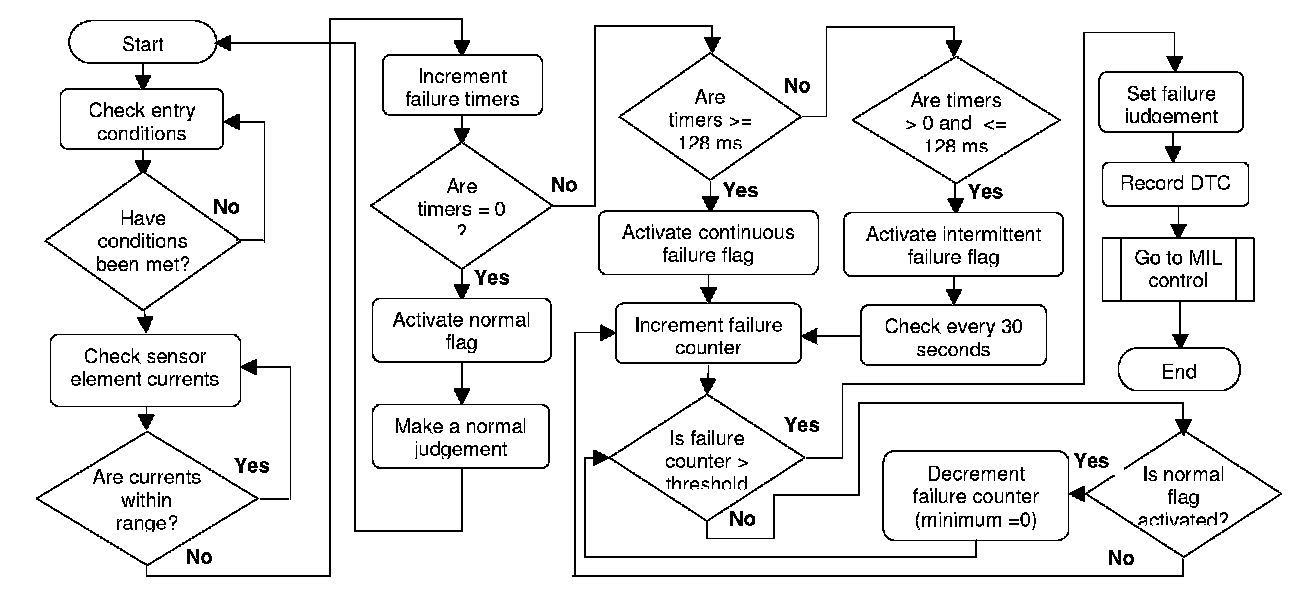 The upstream oxygen sensors current is compared to a failure threshold. If the signal is higher or lower than a pre-defined amount, a timer is started. A continuous fault flag is set if the timer exceeds a threshold. If the failure timer lies below this range but is greater than zero, then an intermittent failure flag is activated. Otherwise a normal flag is set.