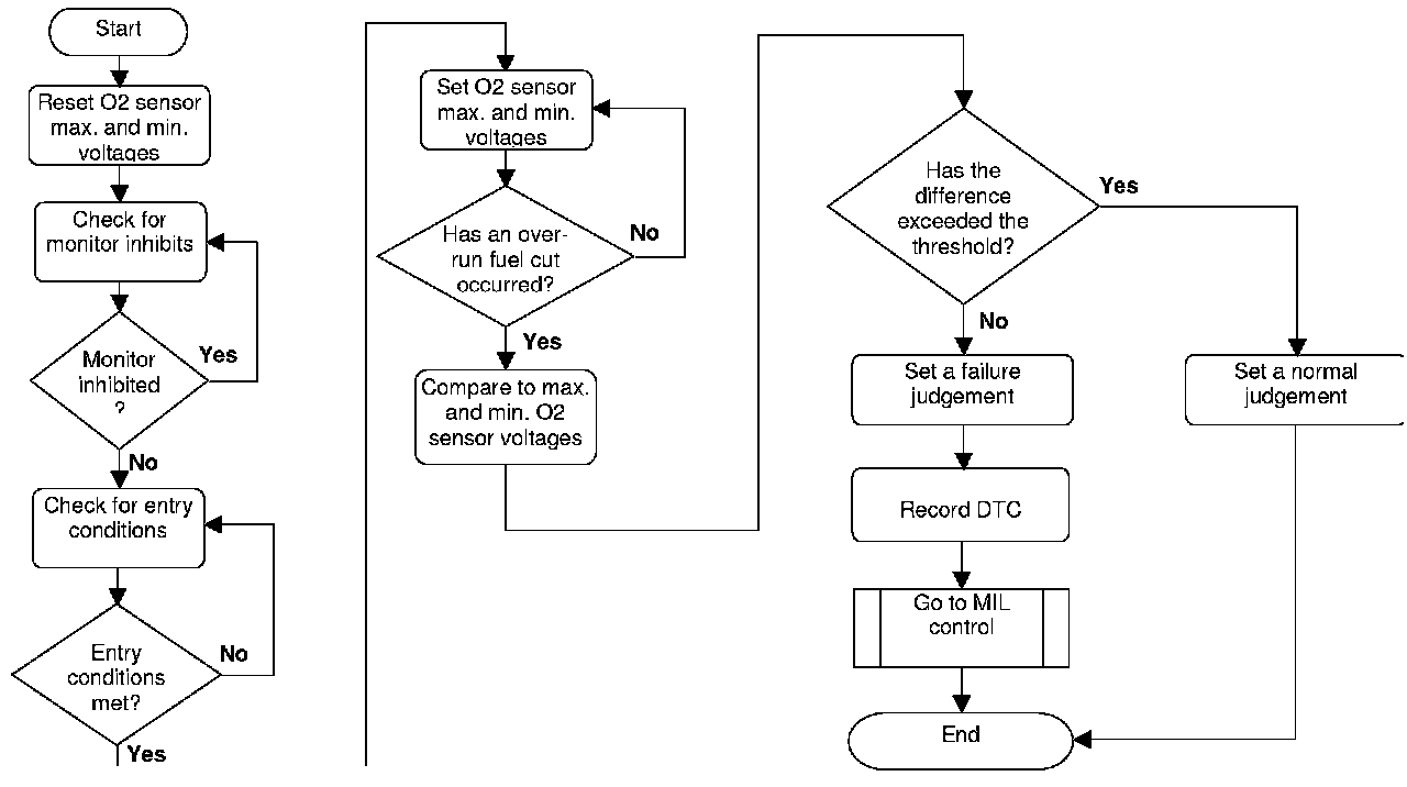 The stuck diagnostic is designed to detect if the downstream oxygen sensor voltage is permanently at a voltage that is within its normal operating range. If the entry conditions are met and that the fuel system and oxygen sensors are in working order, the downstream oxygen sensor maximum and minimum voltages are continuously updated. After a fuel-cut has been performed, the difference in voltages before and after the fuel cut is compared. If the difference has not exceeded a threshold then a fault code will be stored.