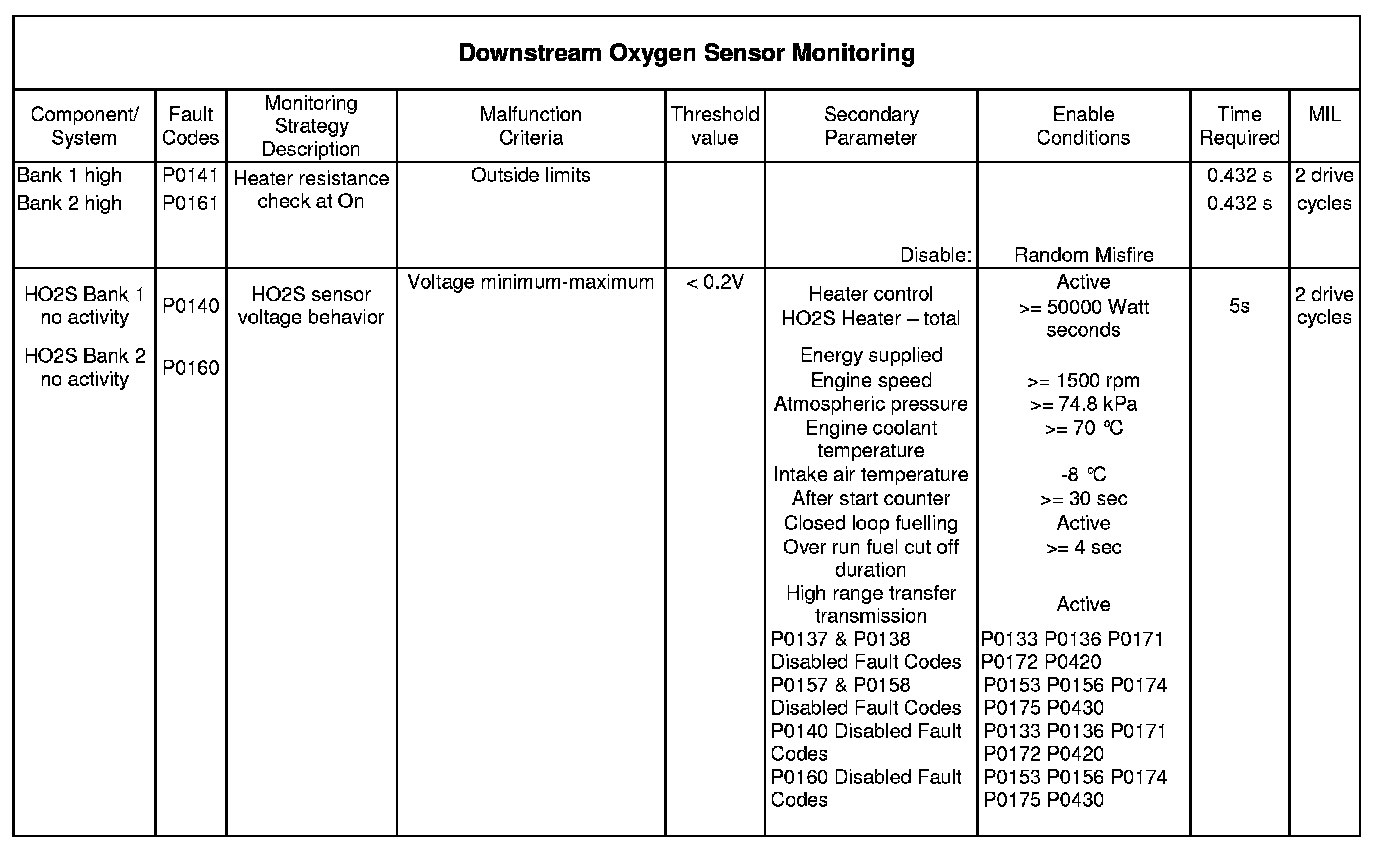If the above table does not include details of the following enabling conditions: - IAT, ECT, vehicle speed range, and time after engine start-up then the state of these parameters has no influence upon the execution of the monitor.