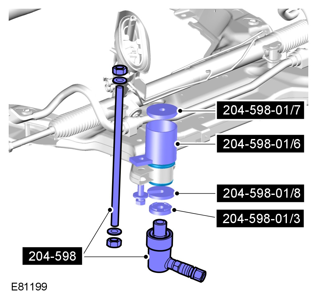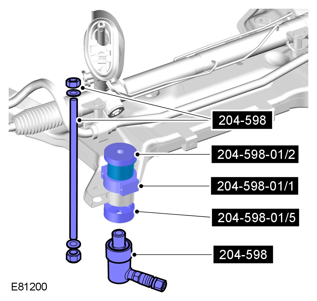 Special tool 204-598-01/8 is used to start the bushing removal process, and must be removed after the bushing has released, as it will not pass through the sub-frame bushing aperture.