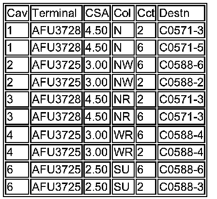 - Wire Chart (Pin-out table) - A six column table, giving details of each wire within the connector: