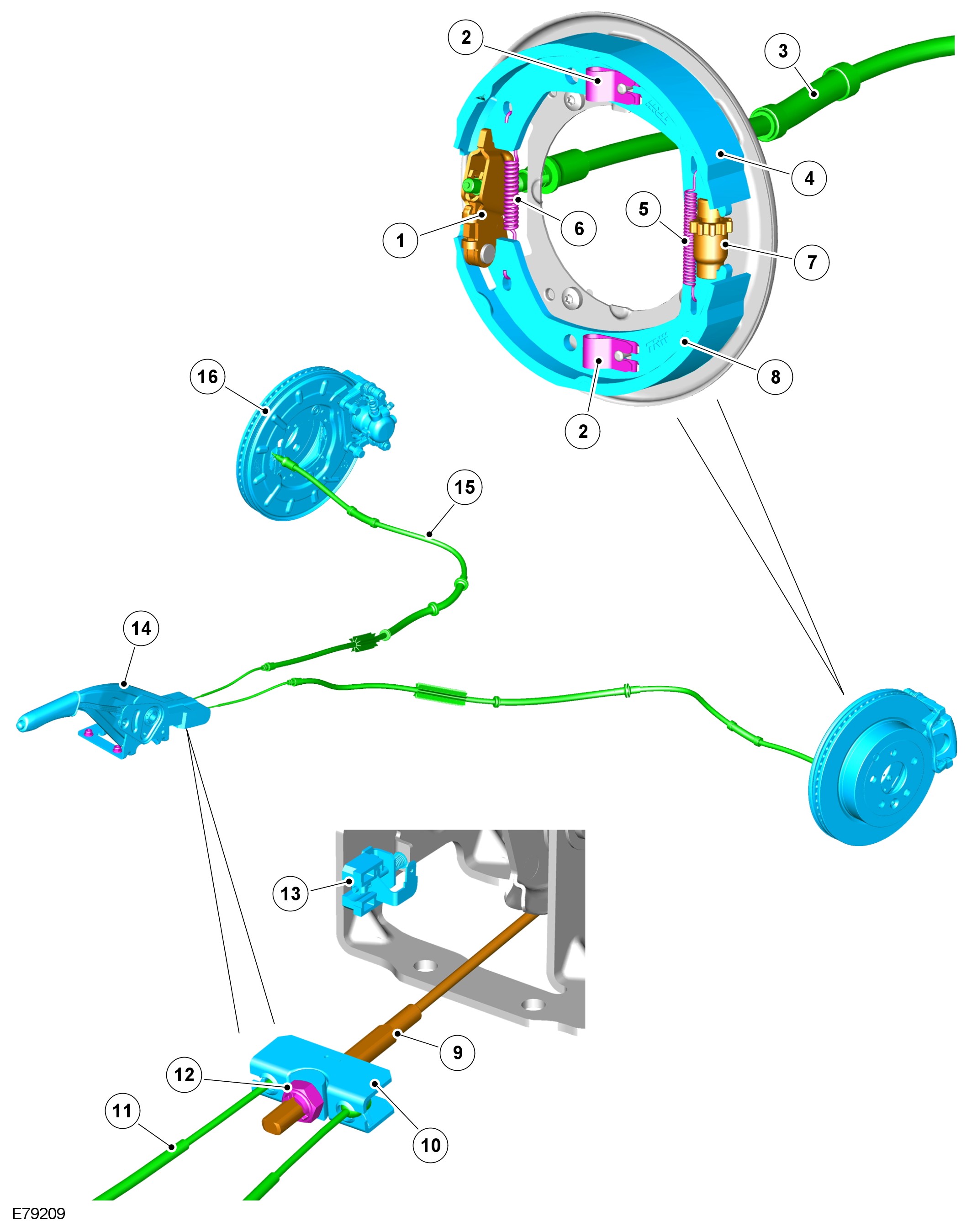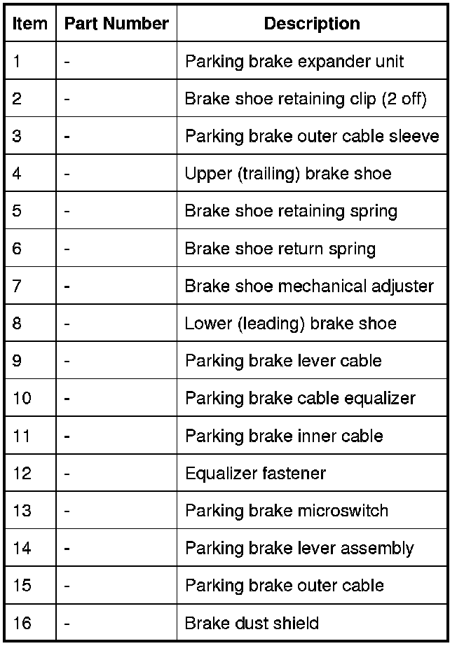 The parking brake is a manually actuated system that operates brake shoes located in the rear brake discs. The inside center of the rear brake disc is manufactured to form the brake drum.