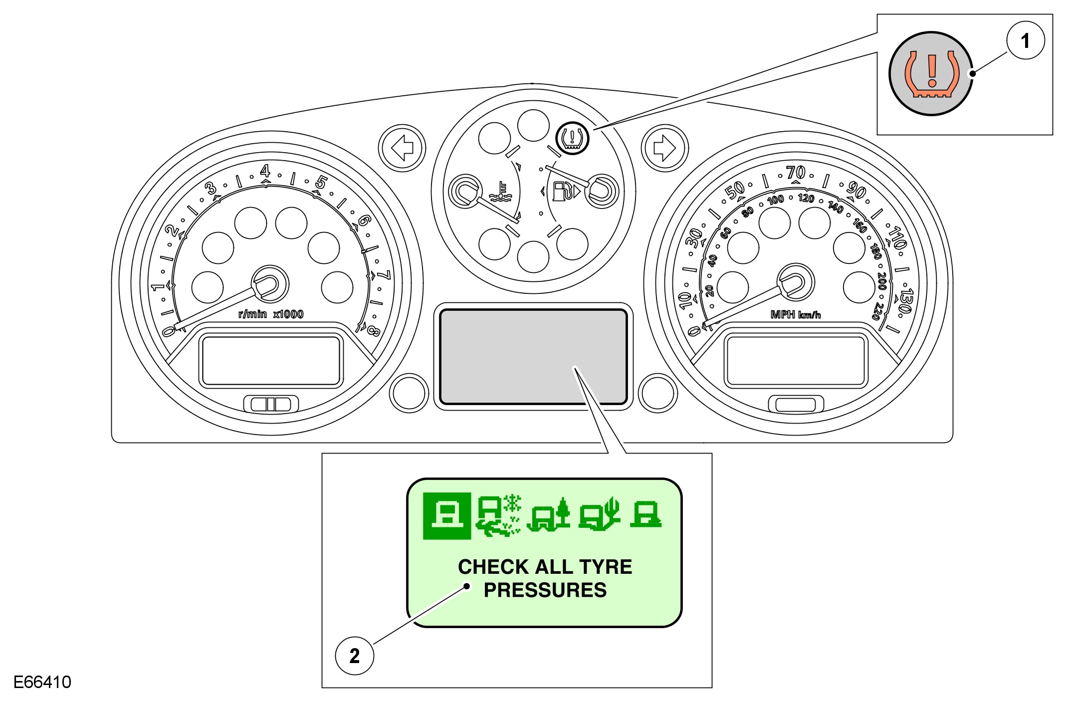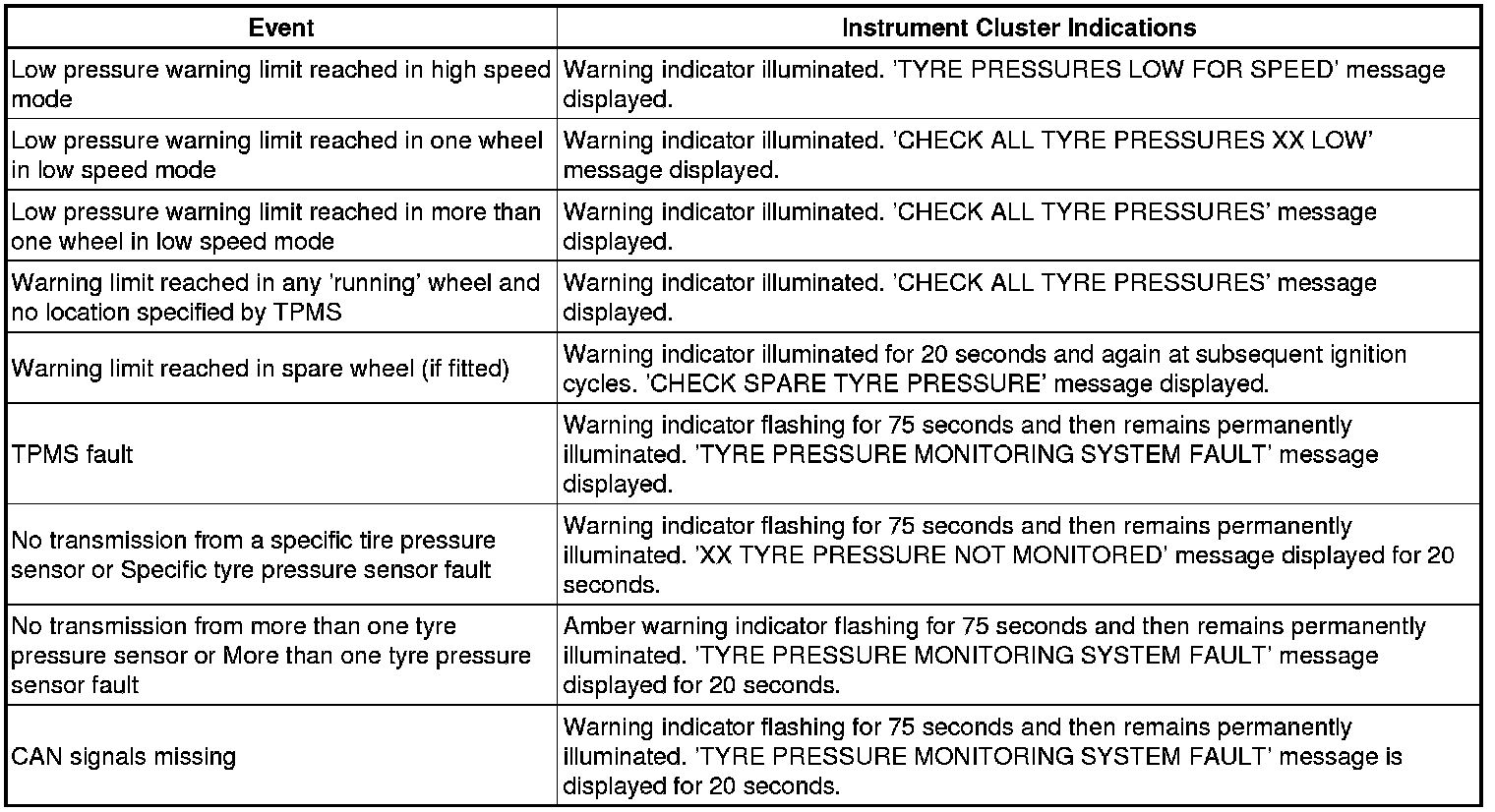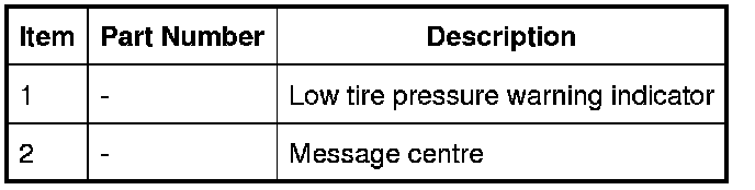 The warning indications to the driver are common on all vehicles fitted with TPMS. The driver is alerted to system warnings by a low tire pressure warning indicator in the instrument cluster and an applicable text message in the message centre.
