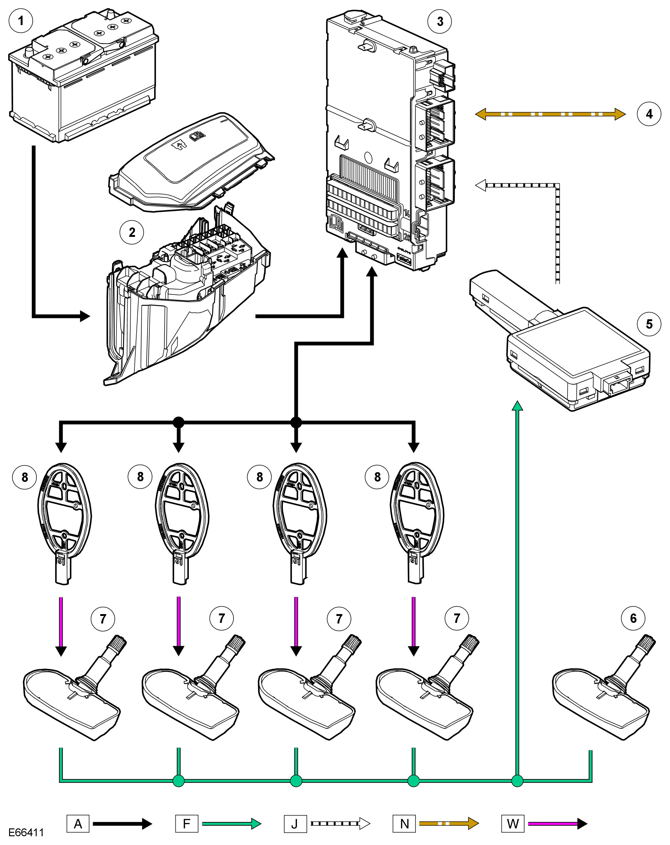A = Hardwired; F = RF transmission; J = ISO 9141 K Line; N = CAN bus Medium speed; W = LF transmission