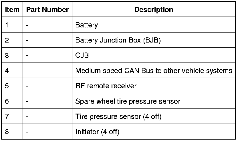 The 4 initiators are hard wired to the CJB. The initiators transmit 125 KHz Low Frequency (LF) signals to the tire pressure sensors which respond by modifying the mode status within the RF transmission. The 315 or 433 MHZ RF signals are detected by the RF receiver which is located at the rear of the vehicle, behind the headlining. The RF receiver is connected to the CJB on the Local Interconnect Network (LIN) bus. The received RF signals from the tire pressure sensors are passed to the CJB on the LIN bus and contain identification, pressure, temperature and acceleration information for each wheel and tire.