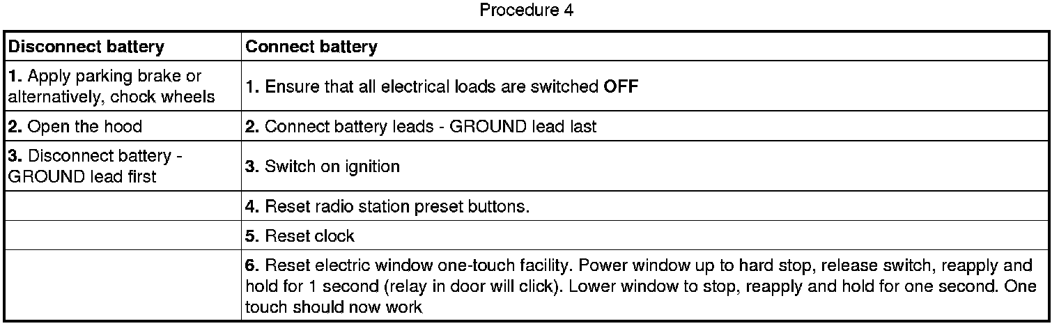 CAUTION: The vehicle status and battery condition must be established before attempting battery disconnect/connect. Reference must be then made to the following table to establish the relevant procedure to be followed.