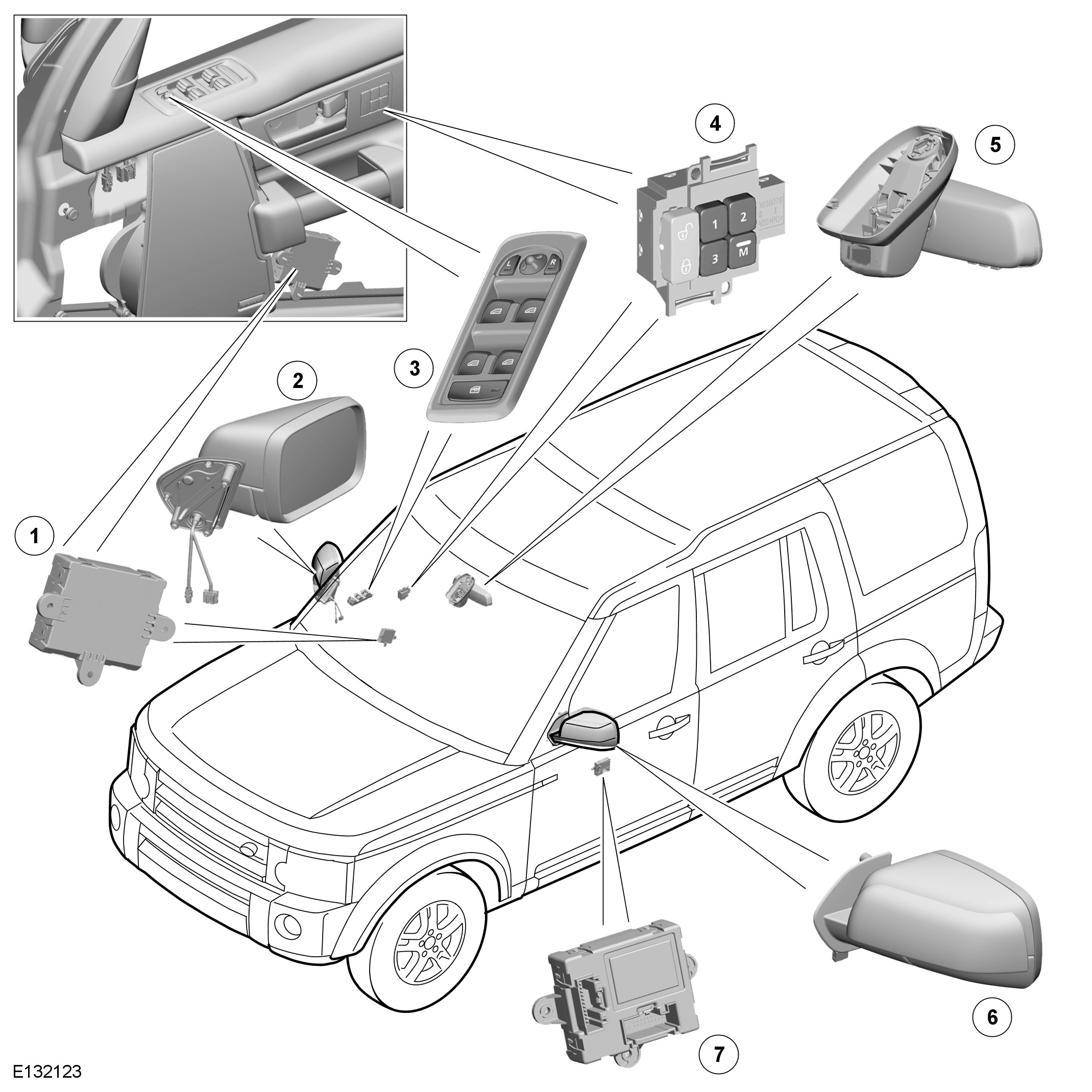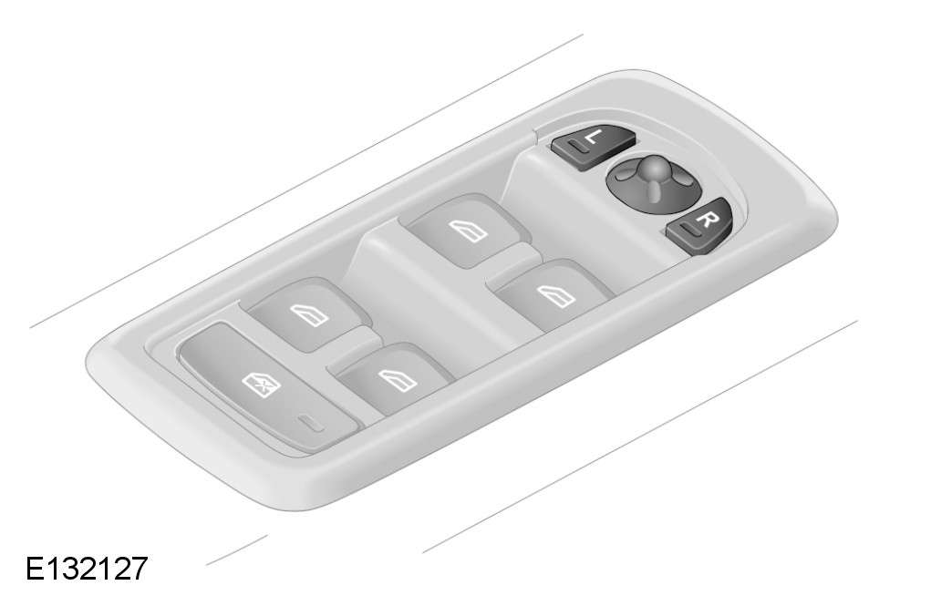 Left and right select switches and an adjustment switch for the exterior mirrors are incorporated into the driver door switchpack in the top of the door casing. The switchpack is connected to the door harness and powered by a permanent battery feed from the CJB (central junction box).