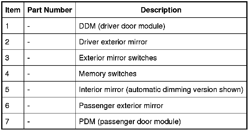 The door modules operate the exterior mirror functions under the control of the CJB (central junction box) and switches in the driver door switchpack.