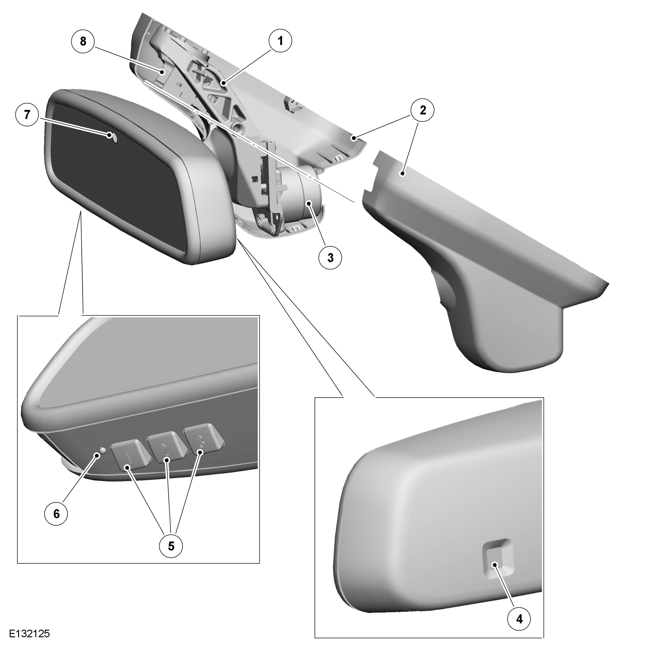 Automatic dimming interior mirrors are connected to the vehicle wiring by an electrical connector concealed by covers installed over the mounting stem. On vehicles with the automatic high beam function, the covers also contain the auto high beam control module.