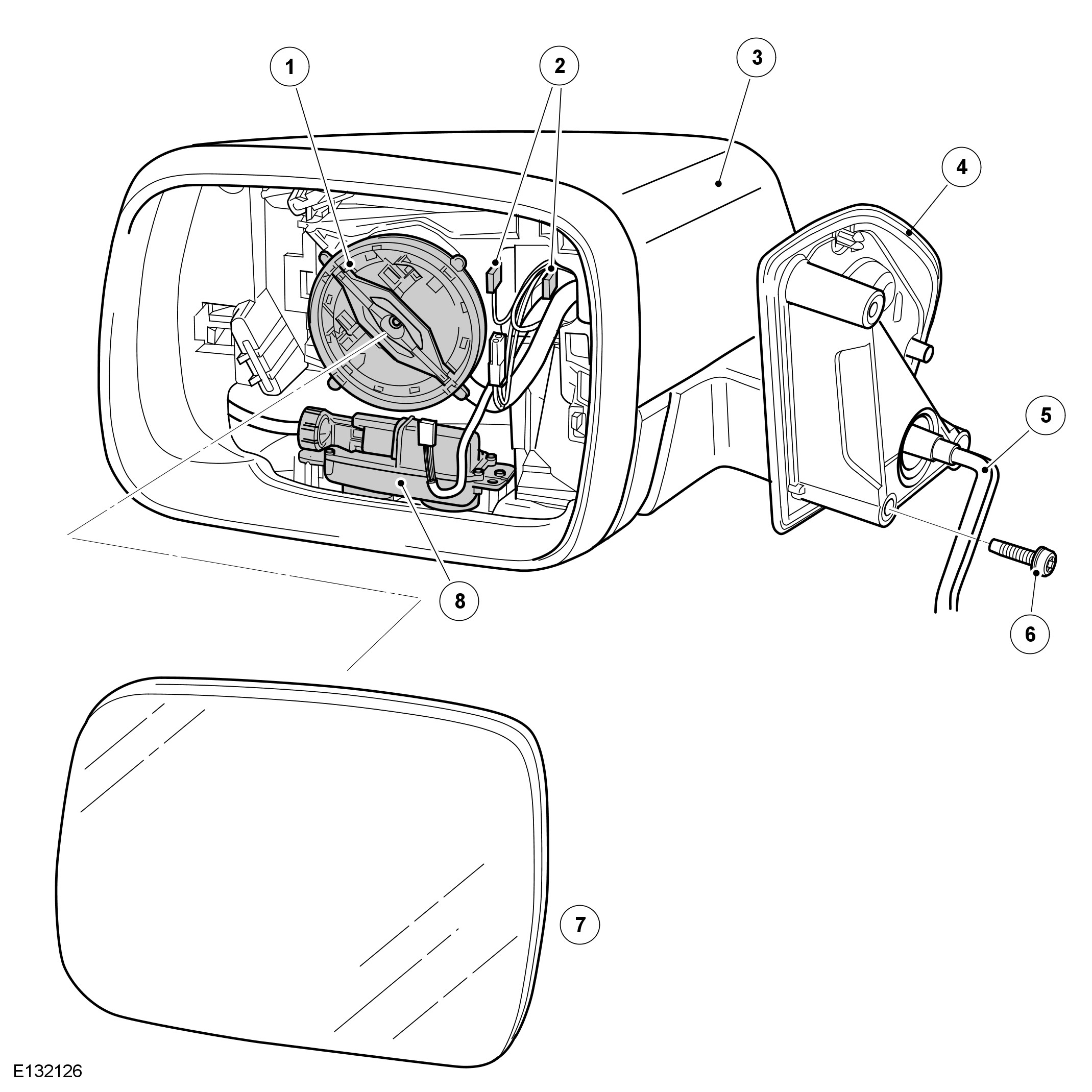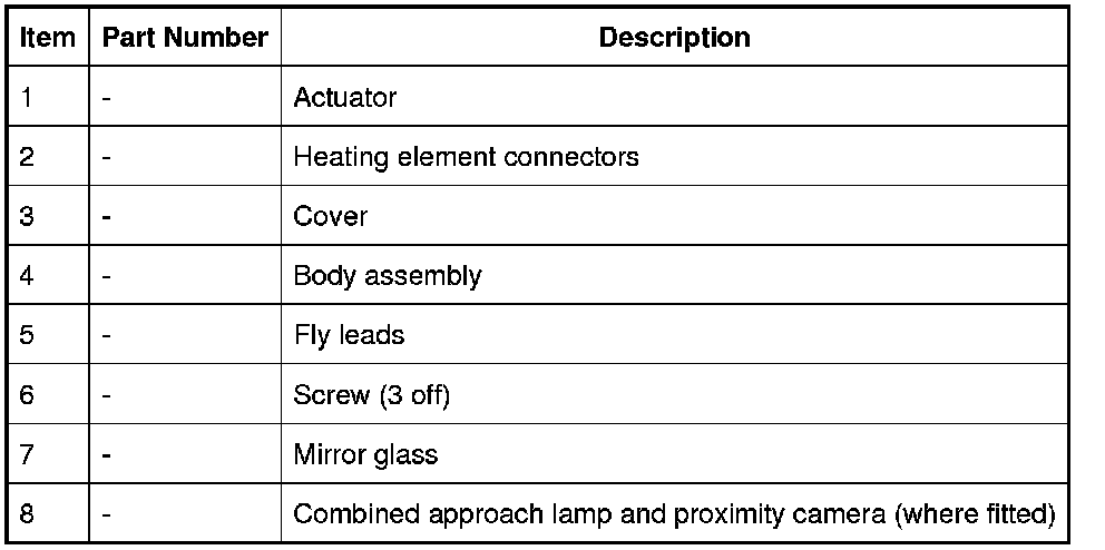 The exterior mirrors each incorporate an actuator which contains two adjustment motors for the mirror glass. One for horizontal (left/right) adjustment and one for vertical (up/down) adjustment. Power to the motors is controlled by the respective door modules in response to signals from the driver door switchpack. On vehicles with memory recall, the exterior mirrors incorporate horizontal and vertical plane position sensors.