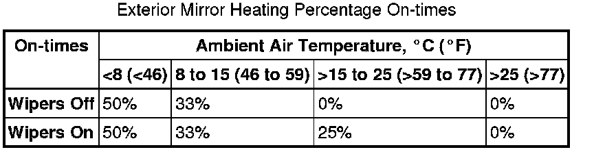 The CJB (central junction box) receives the ambient air temperature value from the ECM (engine control module) on the high speed CAN (controller area network) bus. The CJB (central junction box) converts the ambient air temperature value to an on-time percentage and transmits it on the medium speed CAN (controller area network) bus to the two door modules, which then energize the exterior mirror heating elements accordingly. The on-time percentage is increased while the windshield wipers are on.