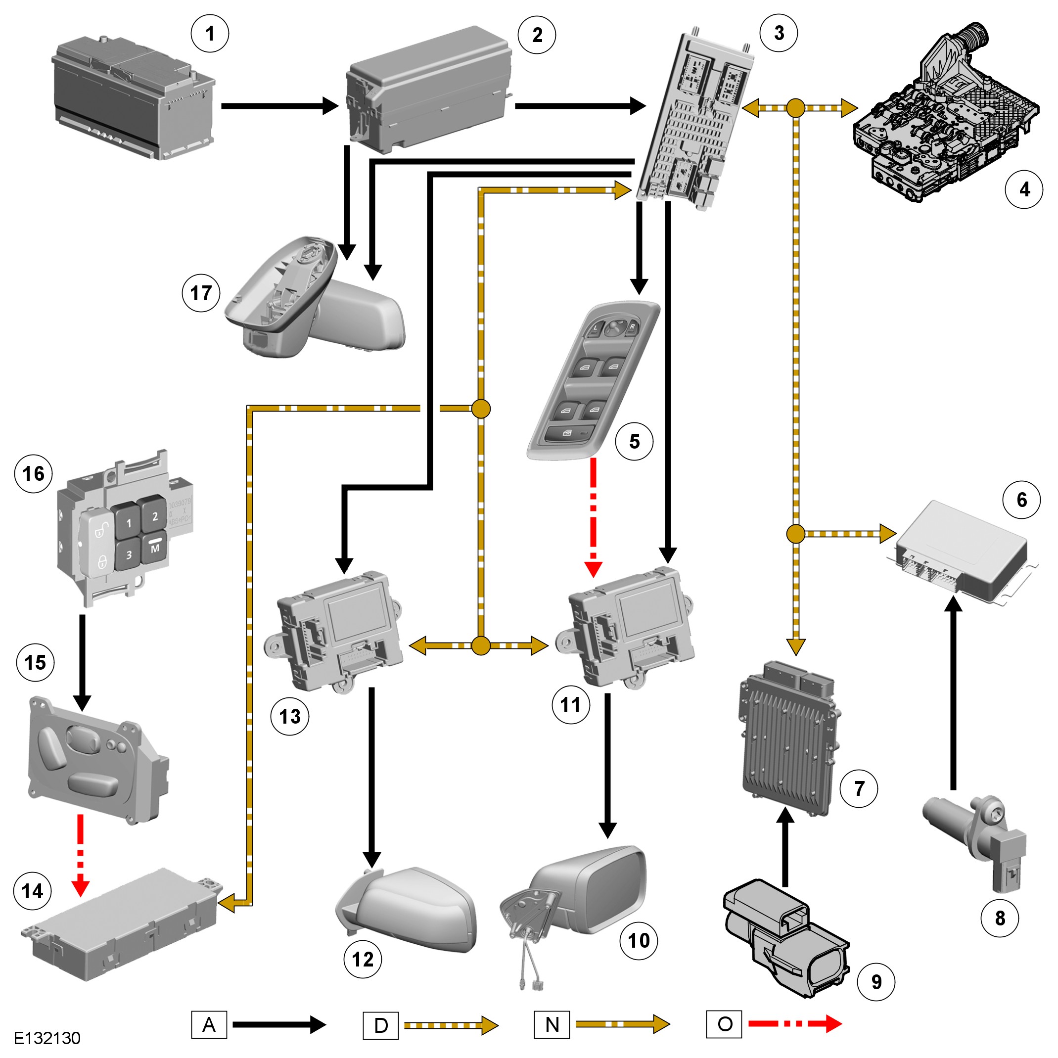 A = Hardwired connection; D = High speed CAN (controller area network); N = Medium speed CAN (controller area network) bus; O = LIN (local interconnect network) bus.
