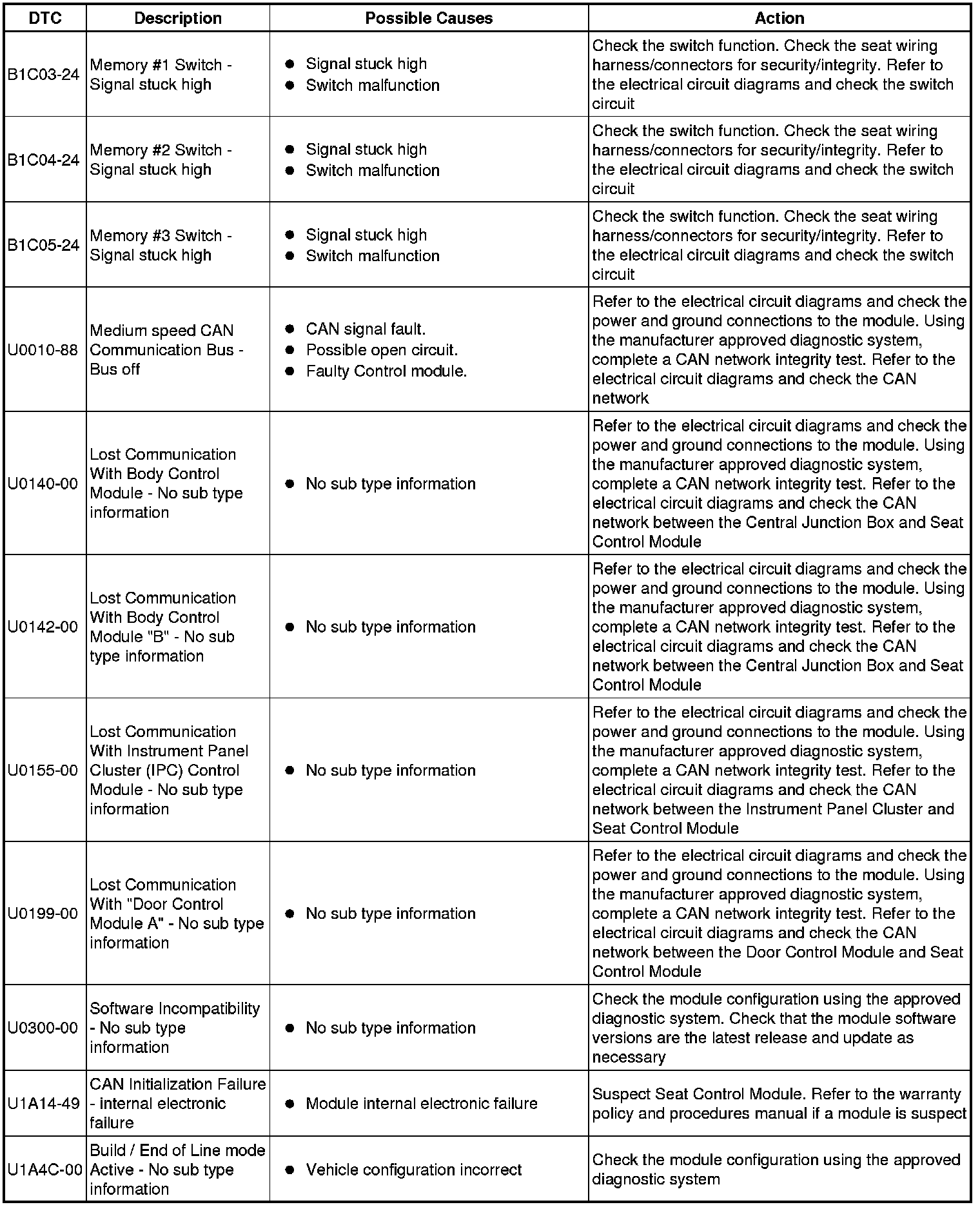 The table below lists all Diagnostic Trouble Codes (DTCs) that could be logged in the Drivers/Passenger Seat Modules, for additional Diagnosis and Testing information refer to the relevant Diagnosis and Testing Section. For additional information, refer to Seats Initial Inspection and Diagnostic Overview