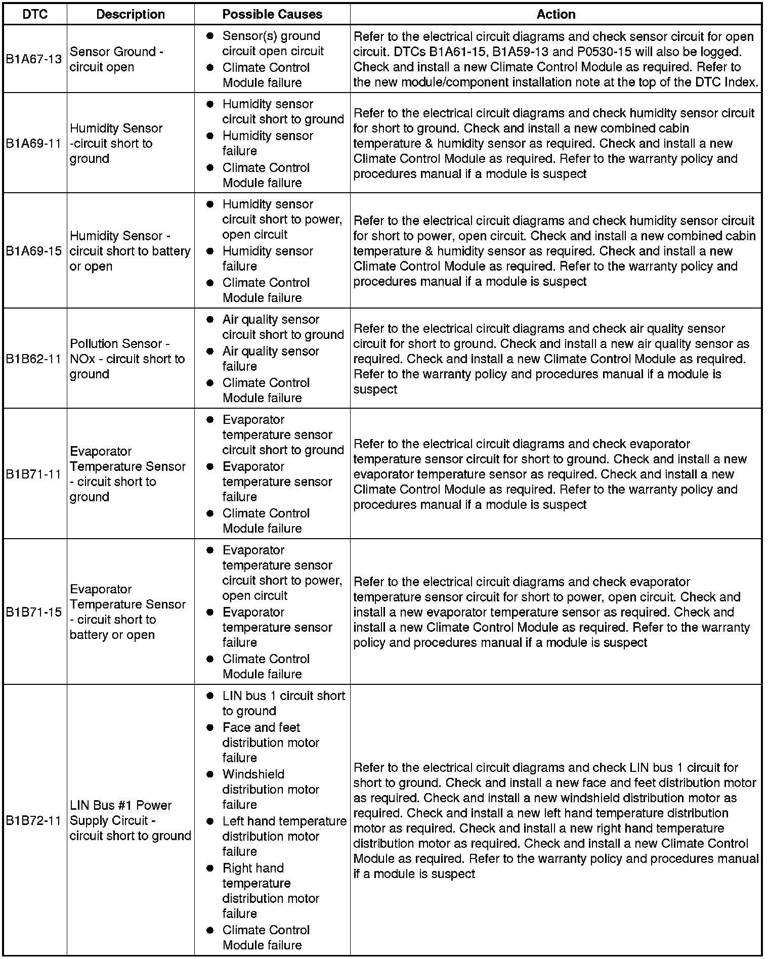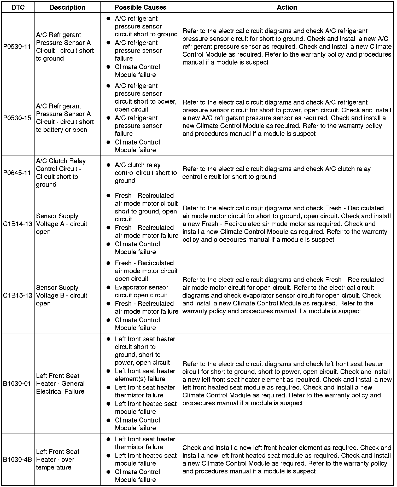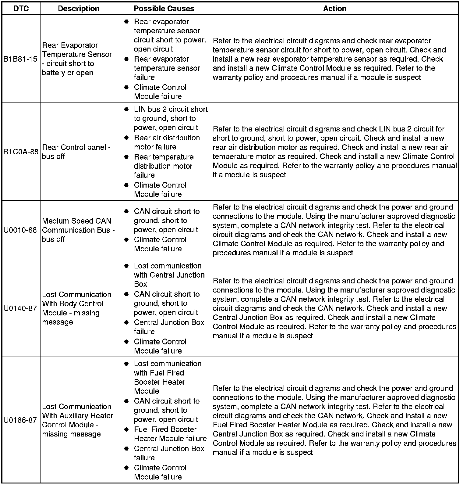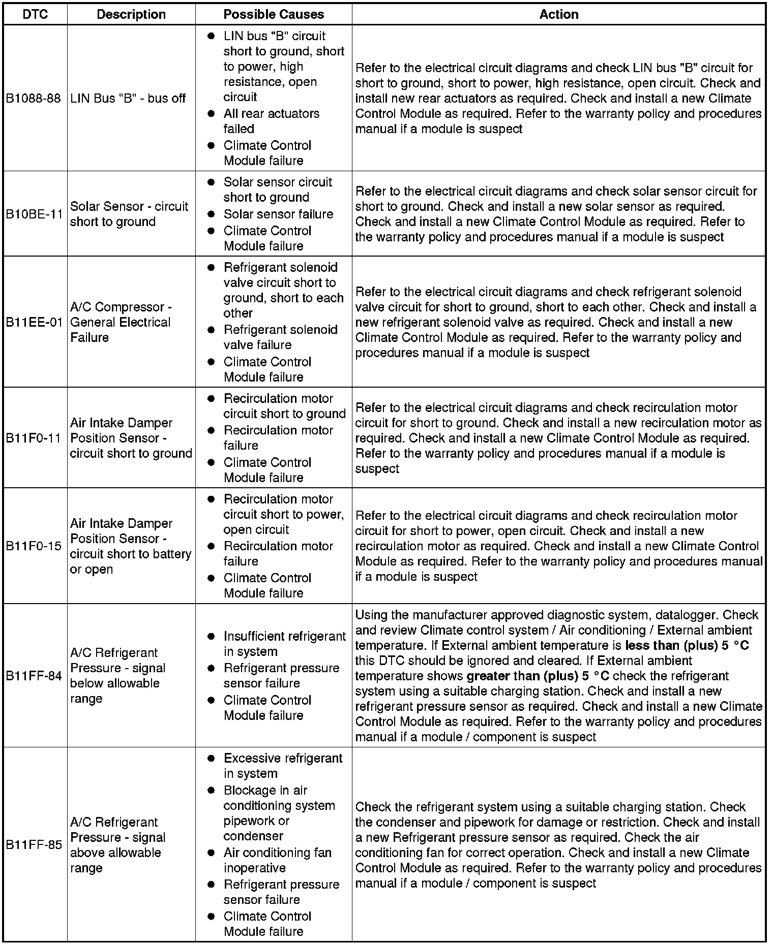 The table below lists all Diagnostic Trouble Codes (DTCs) that could be logged in the Climate Control Module , for additional Diagnosis and Testing information refer to the relevant Diagnosis and Testing Section. For additional information, refer to Climate Control System Climate Control System