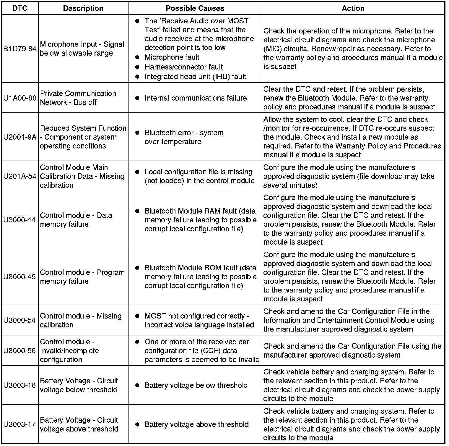 The table below lists all Diagnostic Trouble Codes (DTCs) that could be logged in the Telephone Control Module, for additional Diagnosis and Testing information refer to the relevant Diagnosis and Testing Section. For additional information, refer to Cellular Phone Initial Inspection and Diagnostic Overview