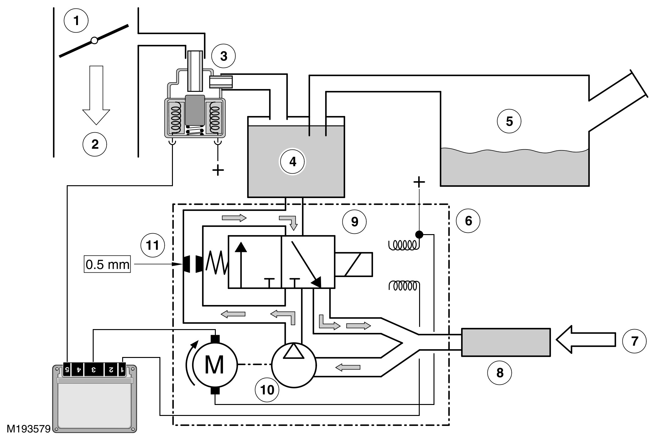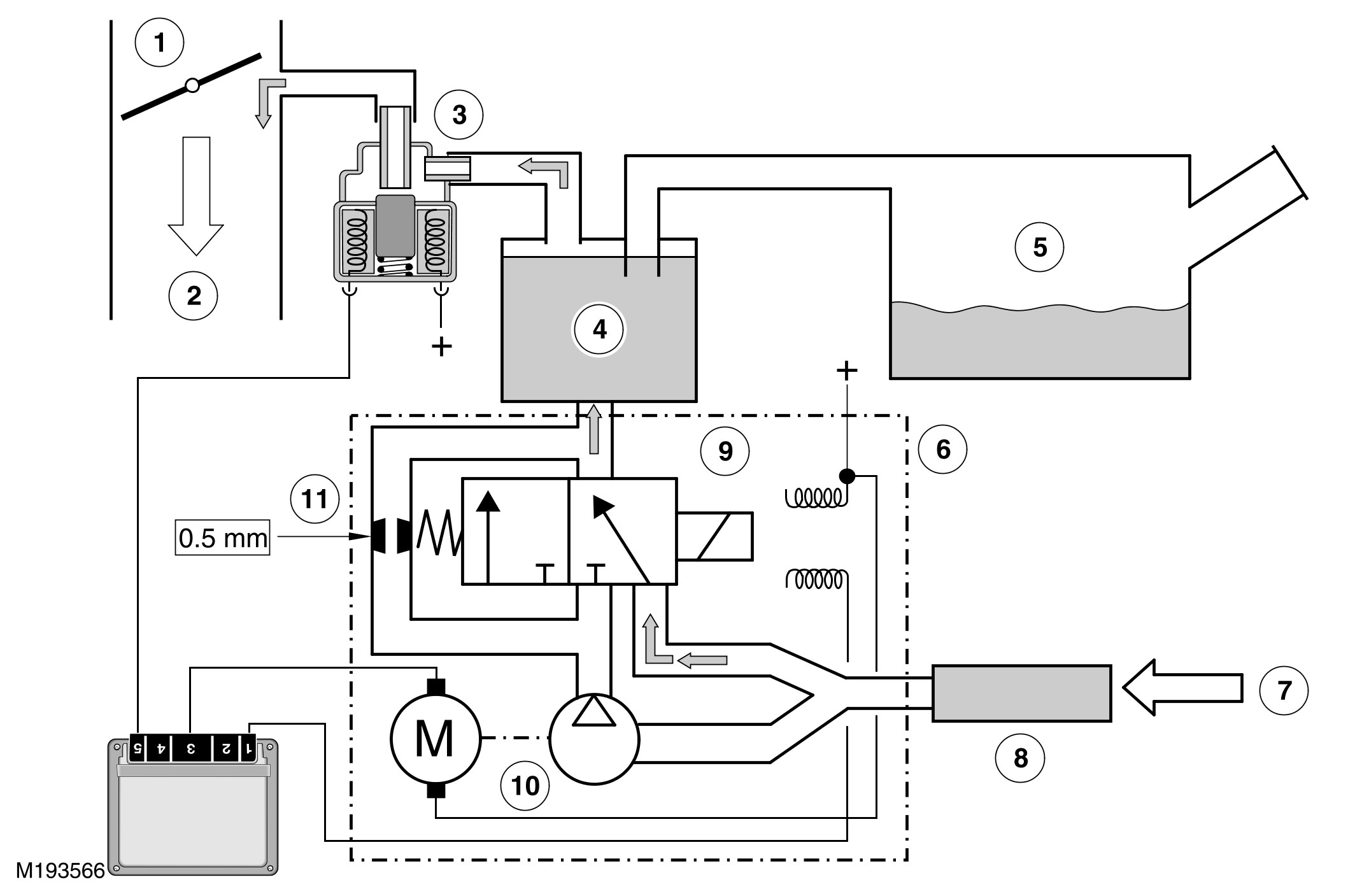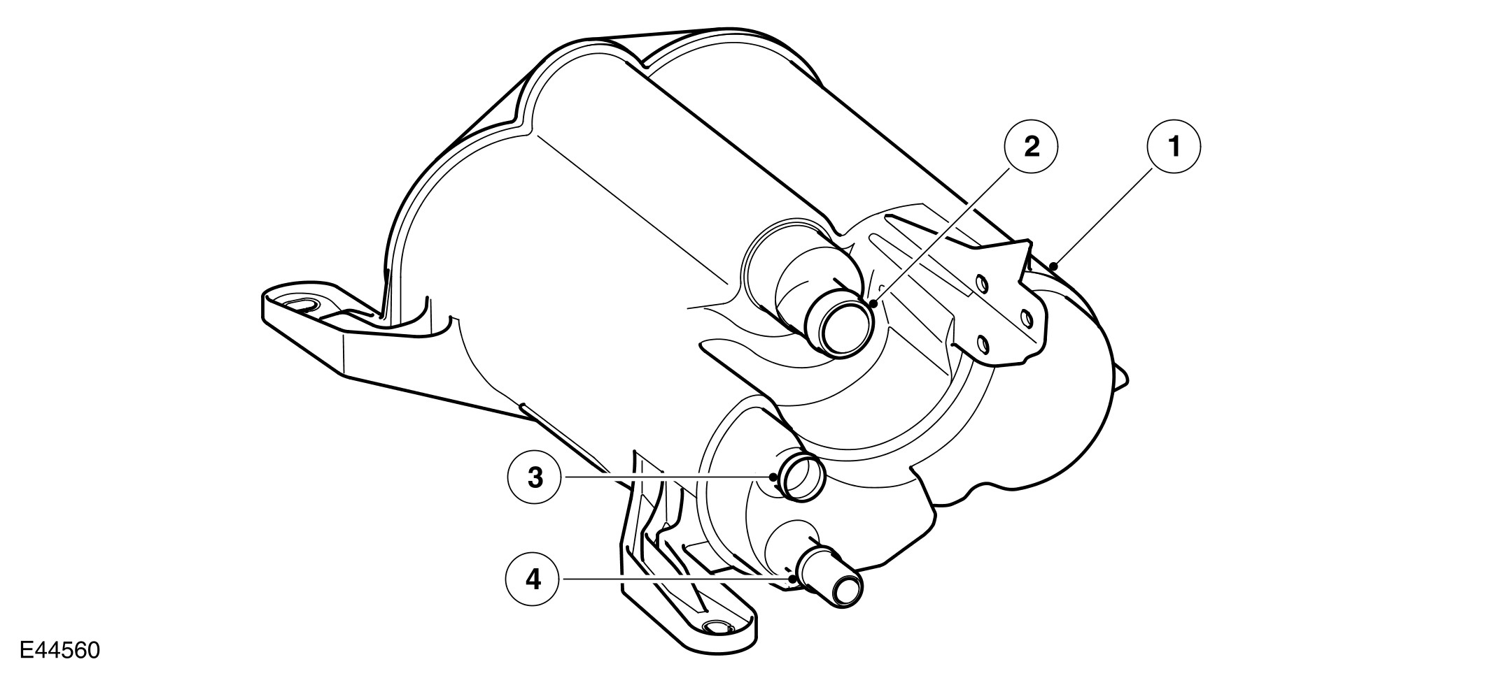 The DMTL pump is connected to the atmospheric vent of the charcoal canister and incorporates an electric air pump, a PTC (positive temperature coefficient) heating element, a normally open change-over valve and a reference orifice. The DMTL pump is only operated when the ignition is off and is controlled by the ECM (engine control module). The ECM (engine control module) also monitors the electric air pump operation and the change-over valve for faults.