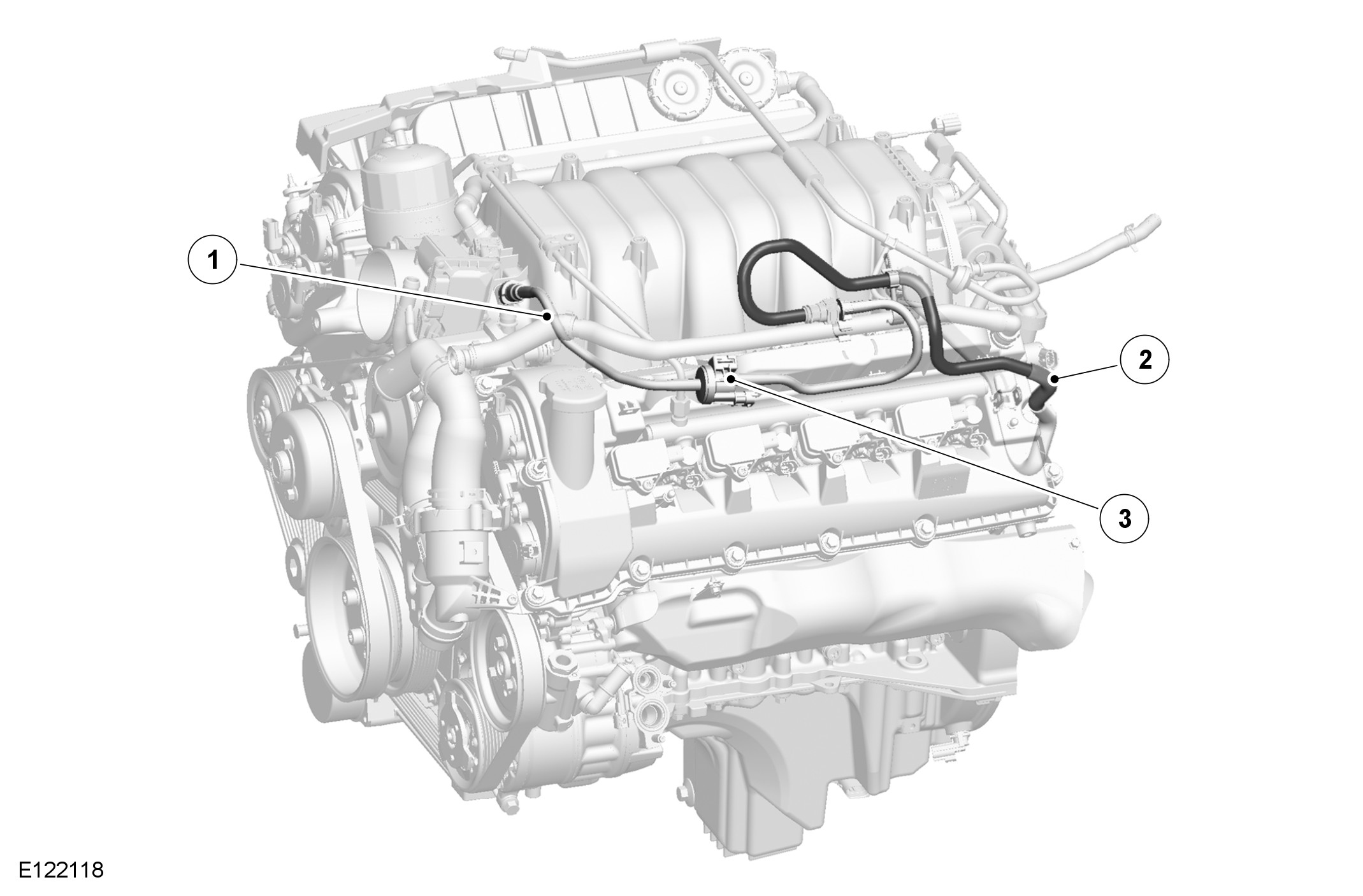 The purge valve is installed on a bracket attached to the LH (left-hand) cylinder head cover. The pipe to the engine from the purge valve is connected to the intake manifold (naturally aspirated vehicles), or SC (supercharger) front cover (SC (supercharger) vehicles), with a quick release connector. The pipe to the charcoal canister from the purge valve is installed between the LH (left-hand) cylinder head cover and ignition coil cover. From the rear of the LH (left-hand) cylinder head, the pipe then goes across the back of the engine, along the RH (right-hand) side of the transmission, along the fuel tank and rearwards of the tank to the charcoal canister.