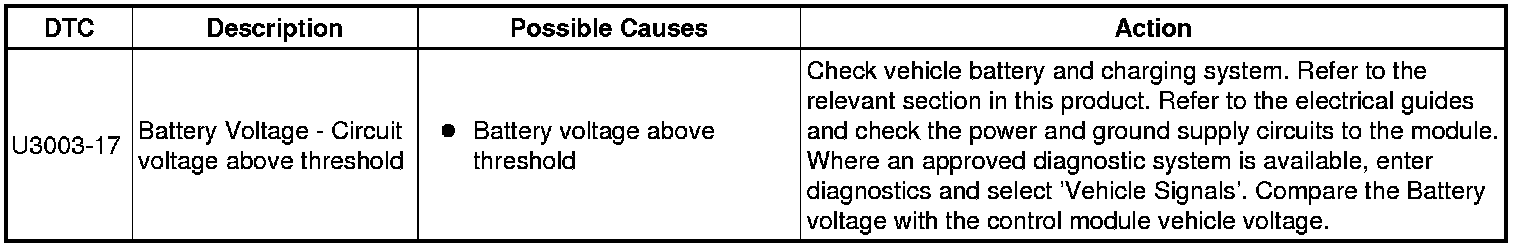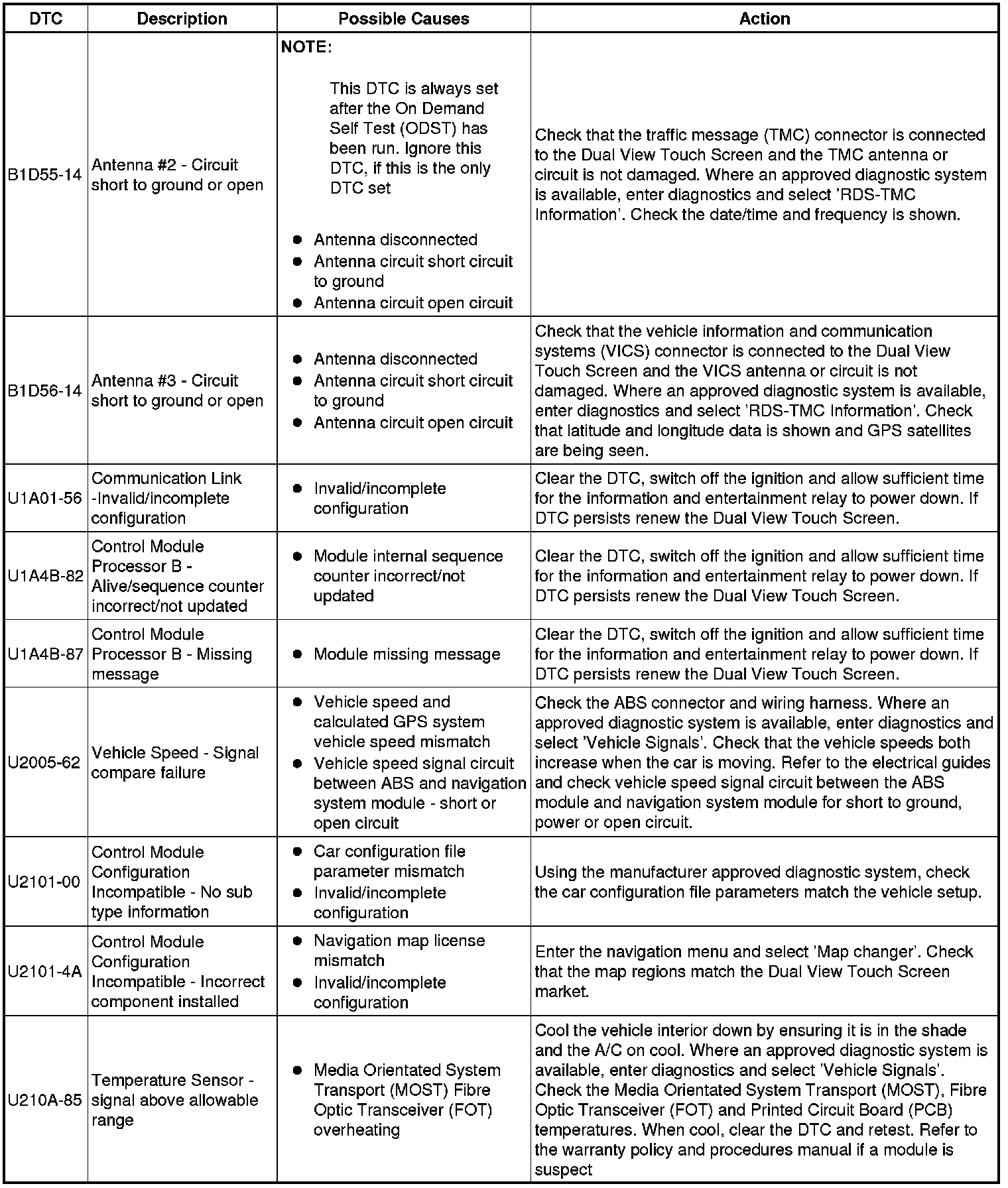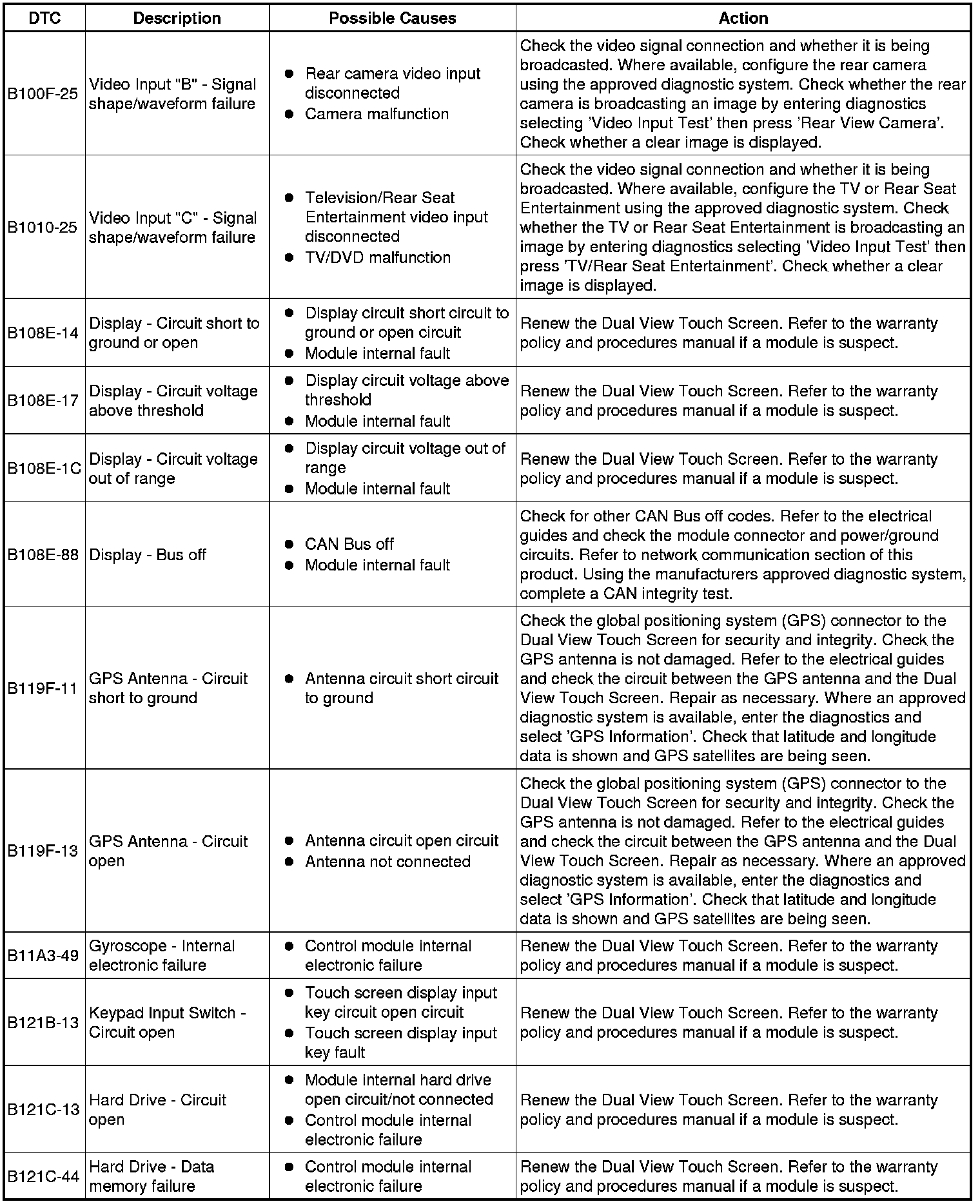 The table below lists all Diagnostic Trouble Codes (DTCs) that could be logged in the Dual View Touch Screen, for additional Diagnosis and Testing information refer to the relevant Diagnosis and Testing Section. For additional information, refer to Information and Entertainment System Initial Inspection and Diagnostic Overview