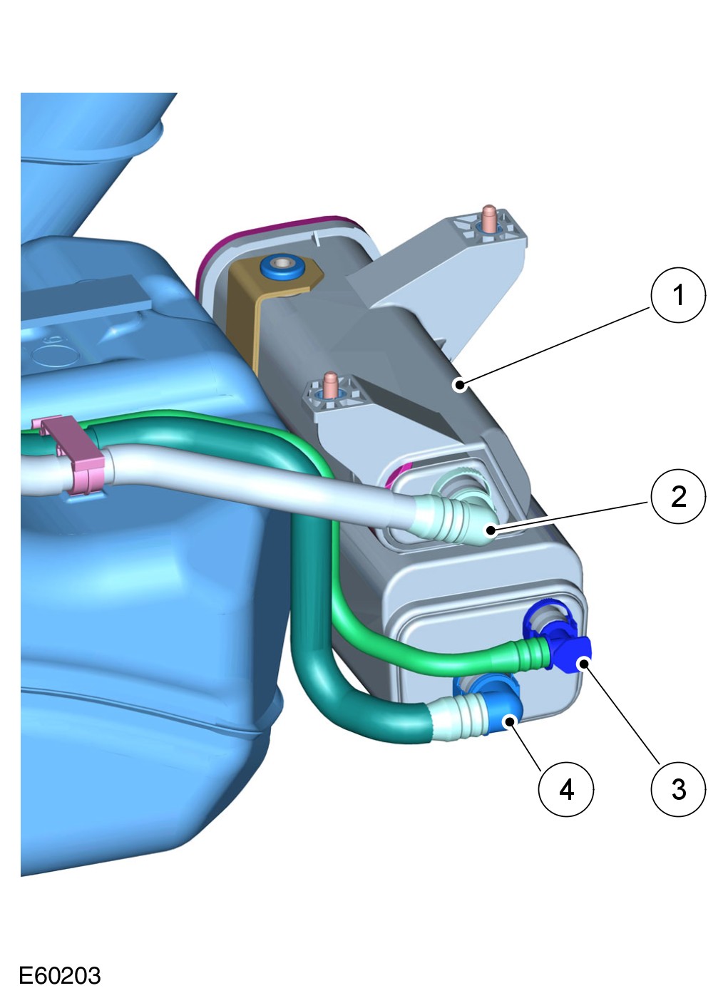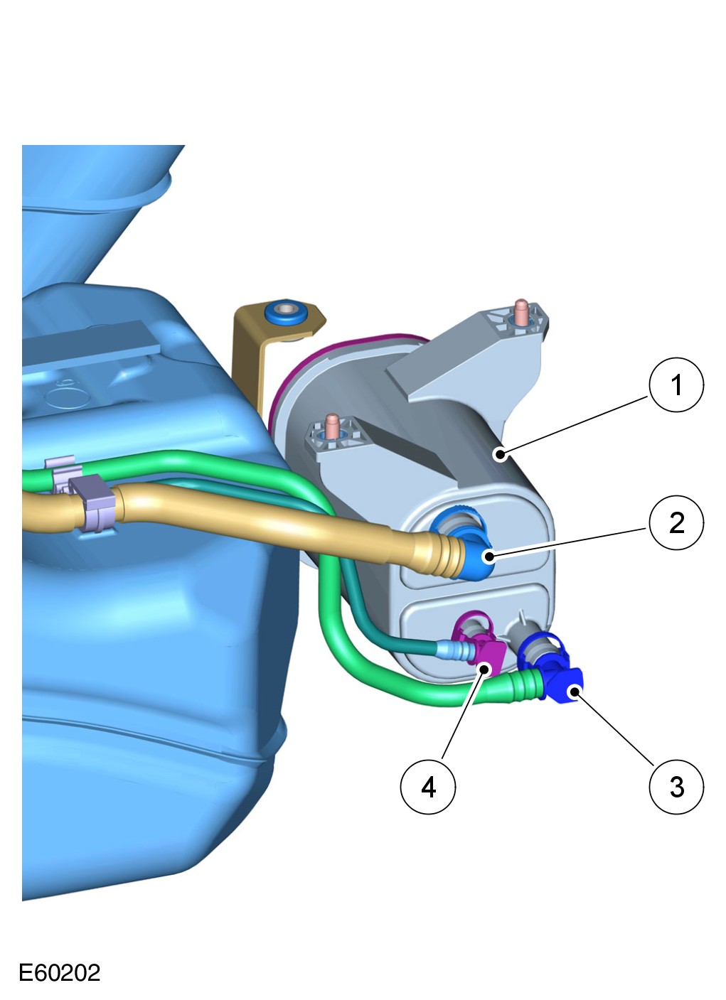 On NAS vehicles the system does not include a pressure test point. To pressure test the pipes of the purge system a special tool must be installed in the quick release connector adjacent to the purge valve or at the engine. This enables a pressure test of the pipes from the purge valve to the charcoal canister or from the engine to the purge valve.
