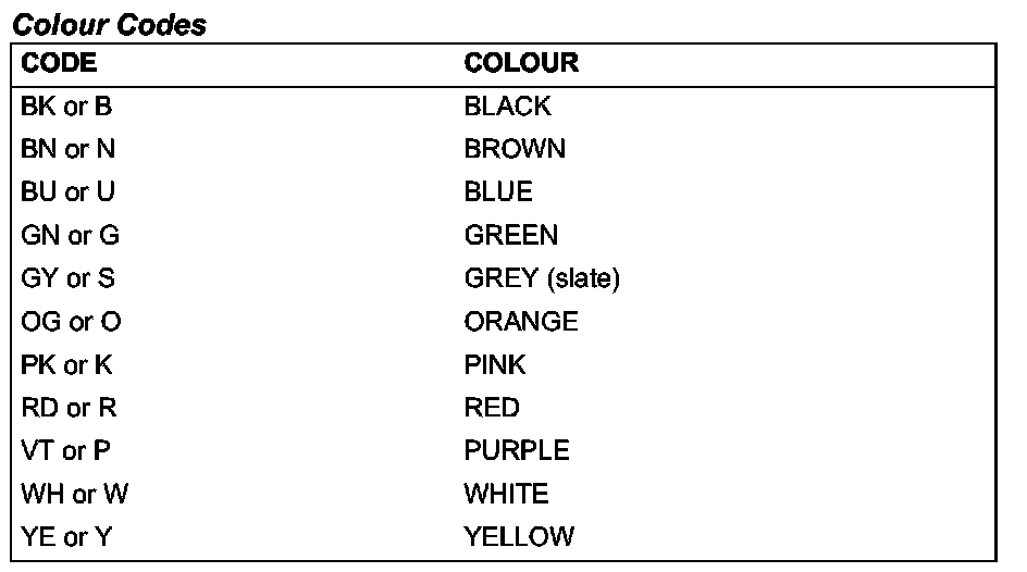 Connectors and header joints are identified by their corresponding connector number with a numbered suffix to indicate the pinout detail of the wire, i.e. C0292-1 identifies connector 292, pin number 1. Wire insulation colours are listed in a table at the end of this section. Where wires have a predominant colour with a secondary colour tracer, the main colour is identified first, i.e. WH-BK - white with a black tracer.