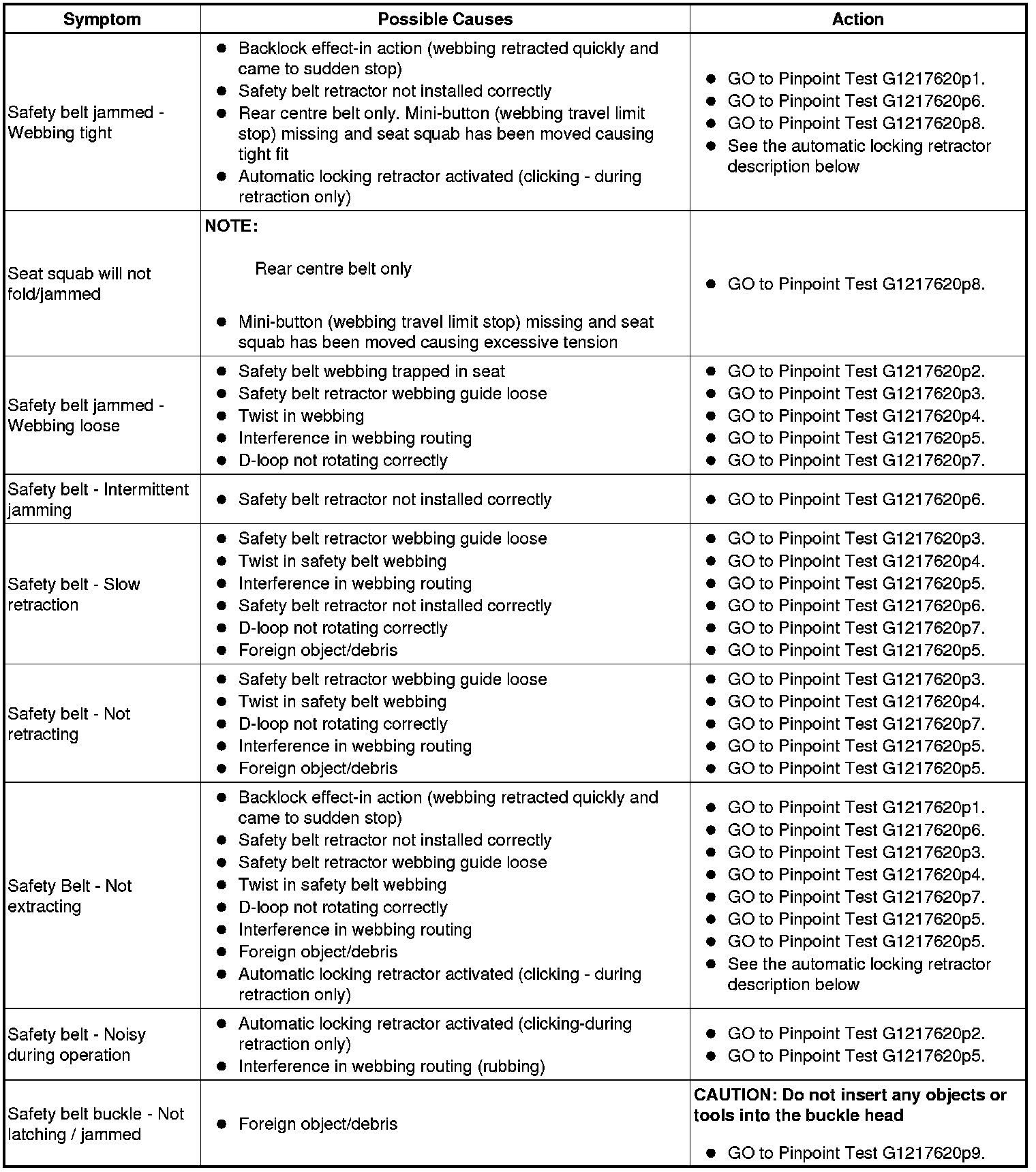 Symptom Chart for Safety Belt Rows 1, 2 and 3