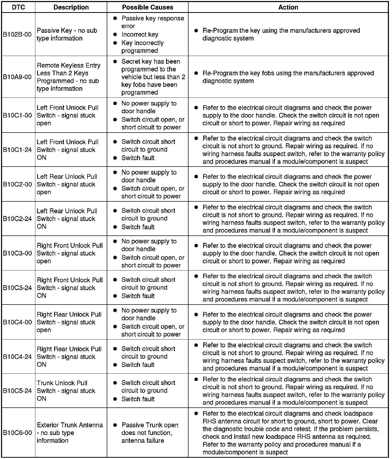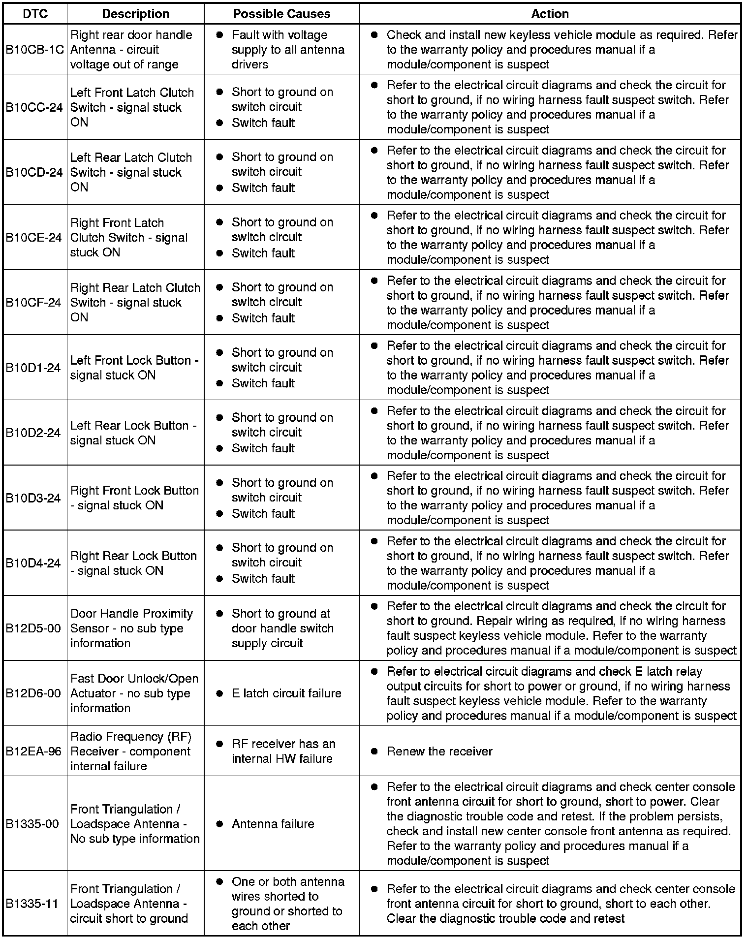 The table below lists all Diagnostic Trouble Codes (DTCs) that could be logged in the Remote Function Actuation Module, for additional Diagnosis and Testing information refer to the relevant Diagnosis and Testing Section.